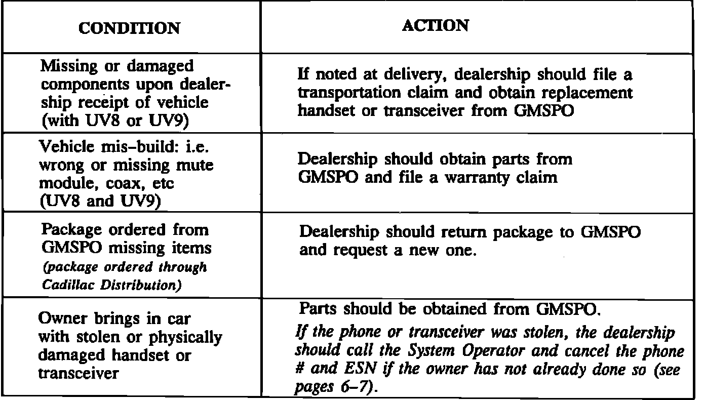 When diagnosis indicates handset or transceiver replacement, BOTH components should be provided to the nearest Motorola Service Shop (MSS) which will repair or replace the components at no charge to the dealership while under waff anty. The entire vehicle should be made available to the MSS whenever possible for maximum diagnostic efficiency. In some instances, antenna or coax cable problems can only be detected if the vehicle is provided to the MSS. By dialing 1-800-331-6456 (outside of Illinois) or 1-312-576-0428 (inside Illinois), information regarding the location of the nearest service shop can be obtained. Phones are staffed from 8:30 to 5:00 Central Standard Time.