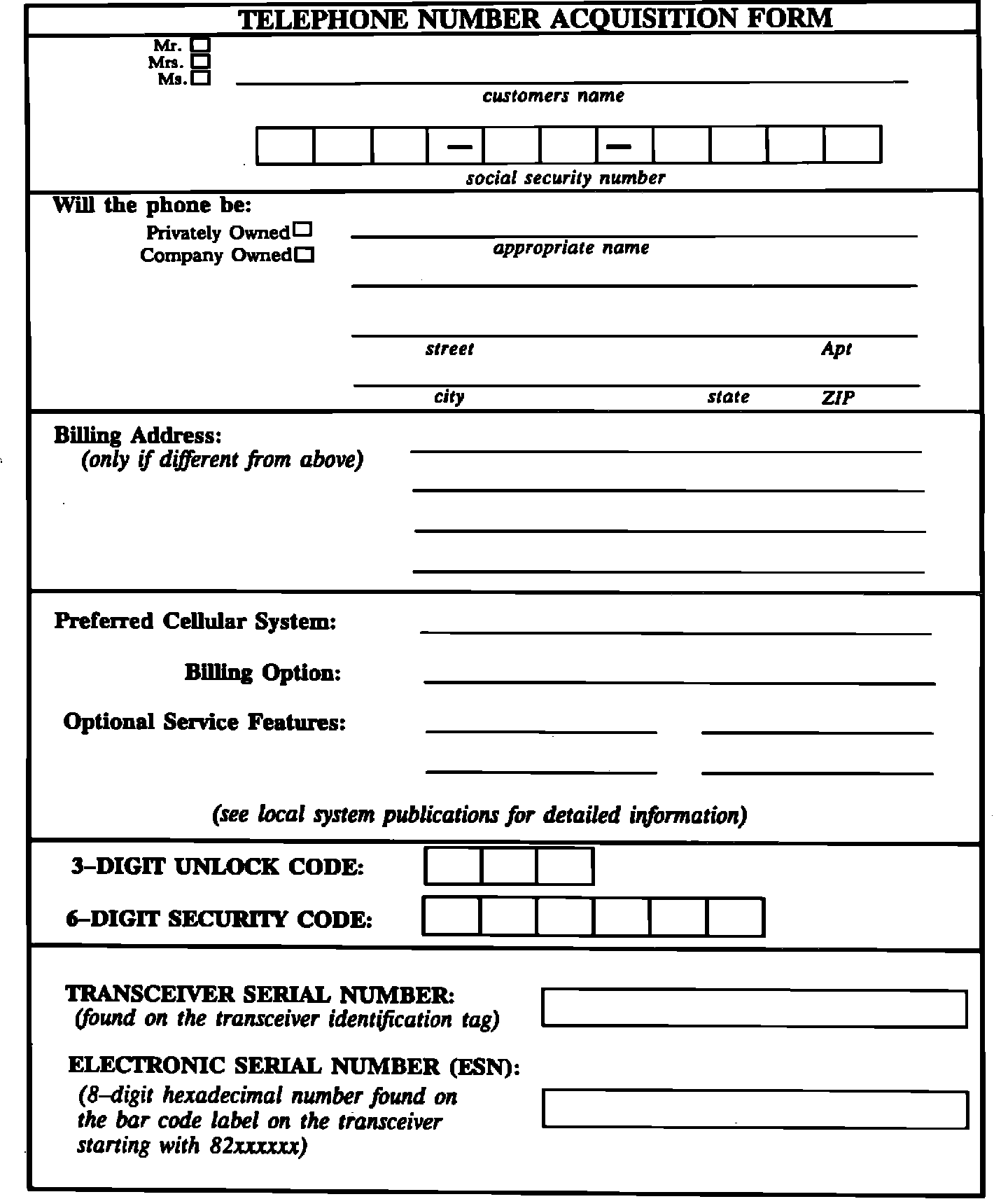 The Dealership should be ready to provide the information below to the Cellular Telephone System Operator in order to establish customer telephone service: