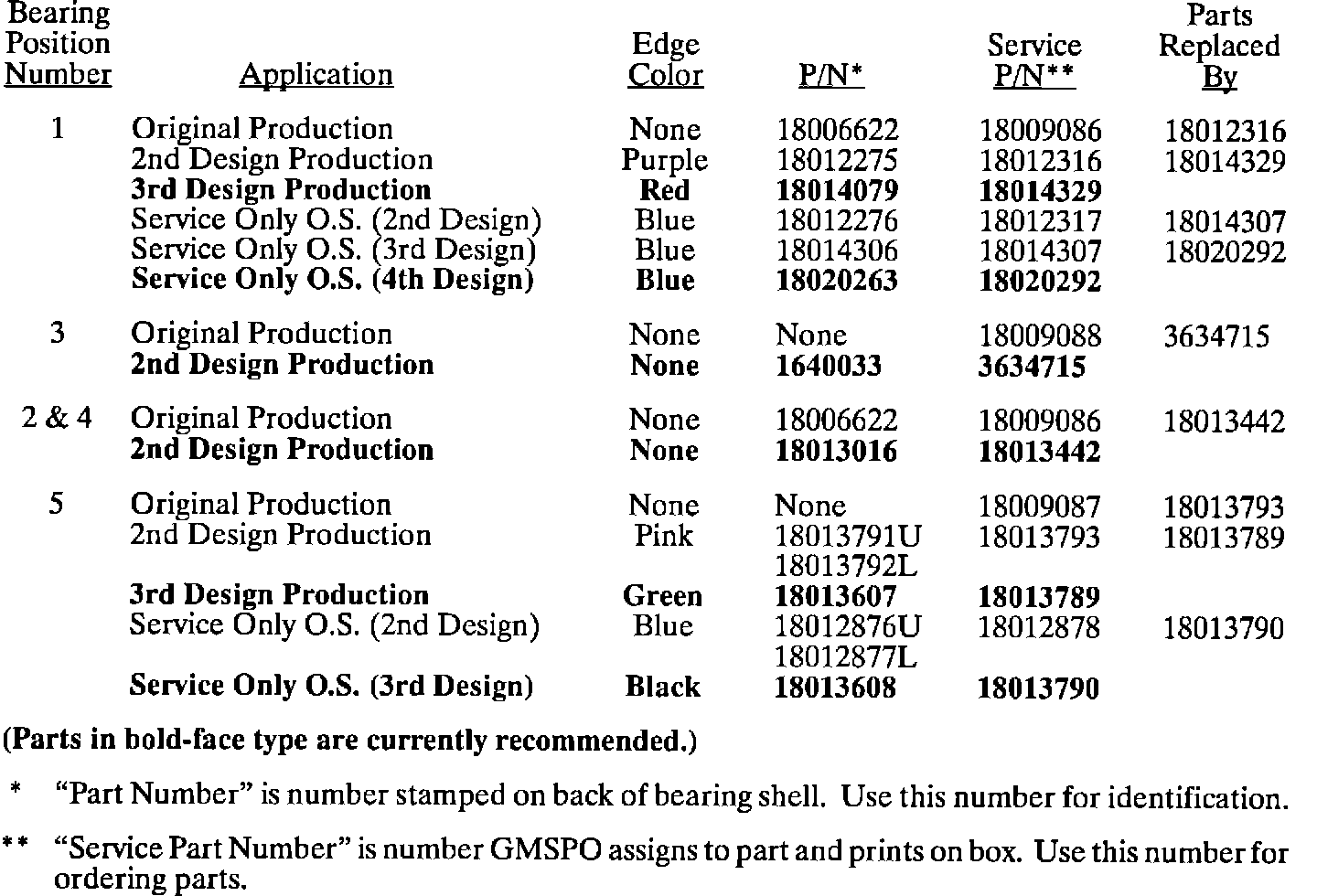 This summary of main bearing applications is intended to clarify current bearing availability and to identify which bearings are in 1982-1990 engines. For 1991 and later applications refer to Service bulletin T-93-1. This information is not intended to supersede the GMSPO parts books and future parts catalog revisions. Superseded part numbers will be handled through GMSPO.