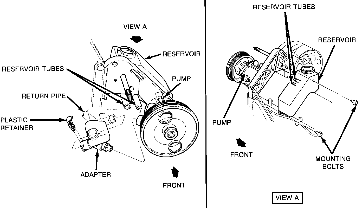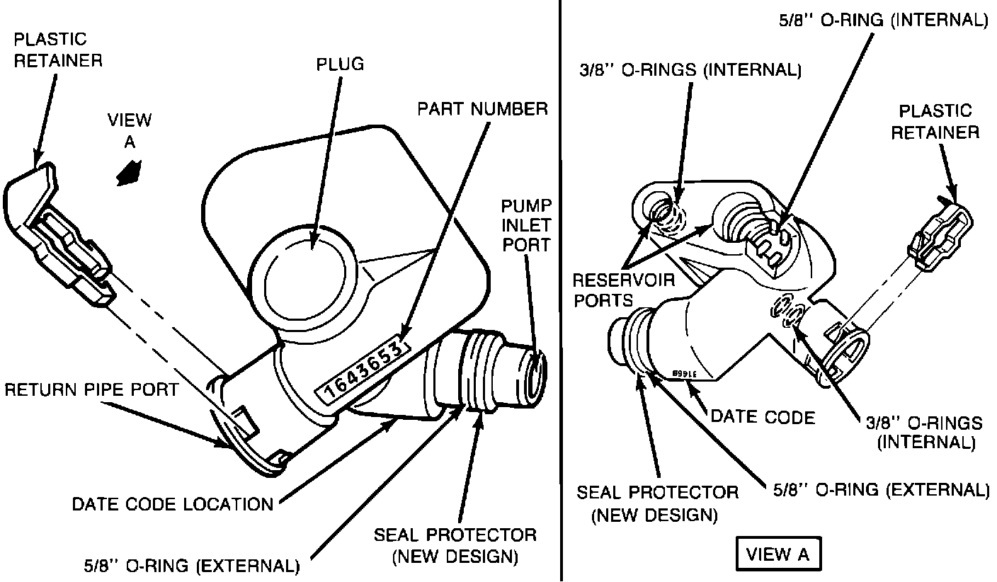 1987 De Ville, Fleetwood, Eldorado and Seville power steering systems include an adapter which transfers power steering fluid from the return pipe to the fluid reservoir and from the reservoir to the pump inlet. See Figure 1. Some vehicles may experience fluid leakage at the connection between the pump and the adapter or at other adapter ports. Additionally, some cars may exhibit pump cavitation noise due to air entering the system at the adapter.