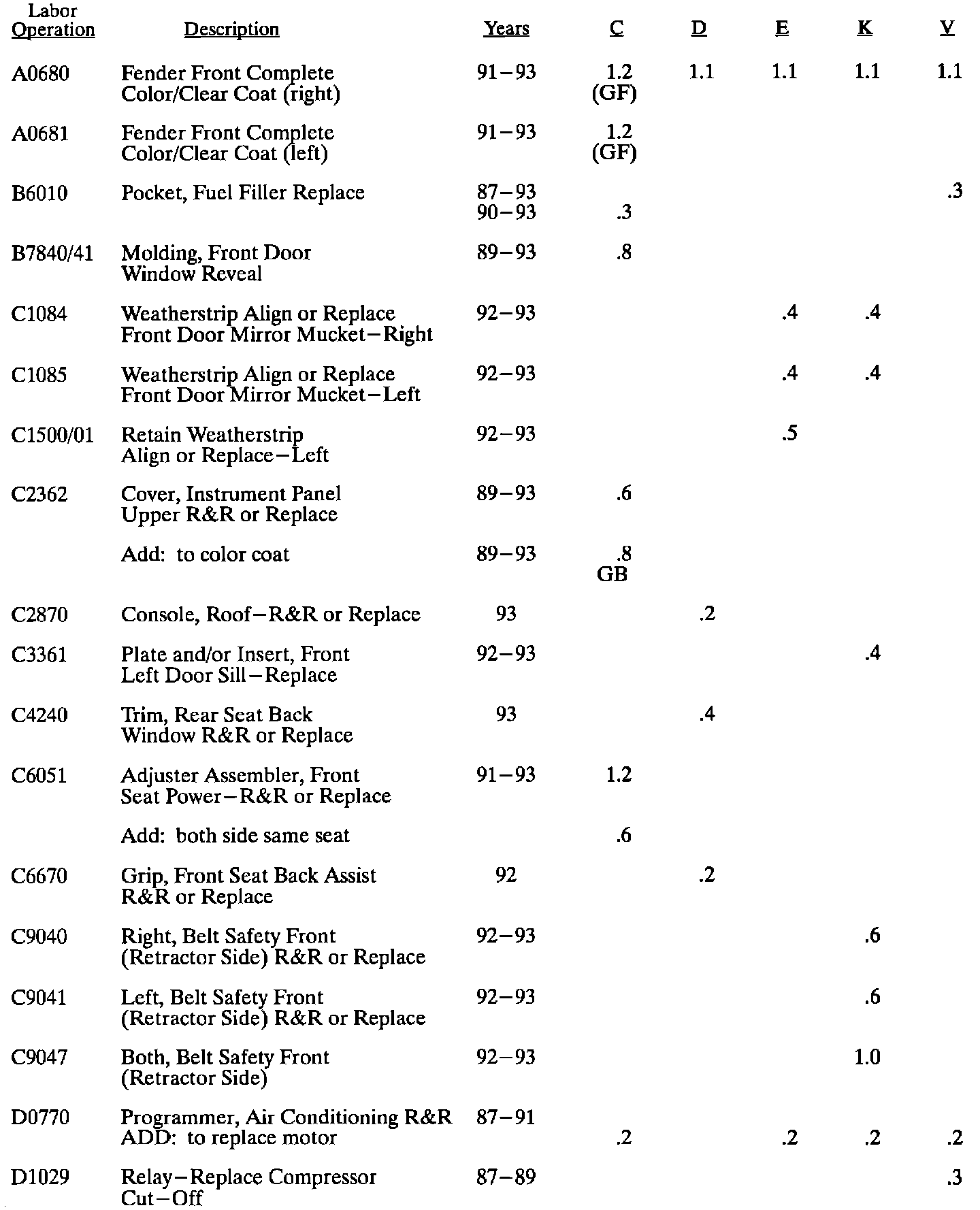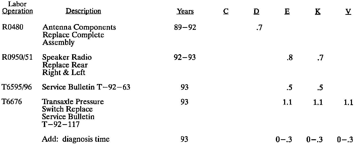 This bulletin contains new Labor Operations or labor times that have increased as a result of "Requests For Review" submitted by Dealers between January 1, 1993 and July 15, 1993. The time changes that apply to 1993 models will be included in future LTG updates but for 1992 and prior models this bulletin is the only place these times will be published. New operations are noted with bold print. "Request for Review" forms are located at the back of your Labor Time Guide. If you have any questions or concerns please contact Brad Merrill at (313) 554-6946.