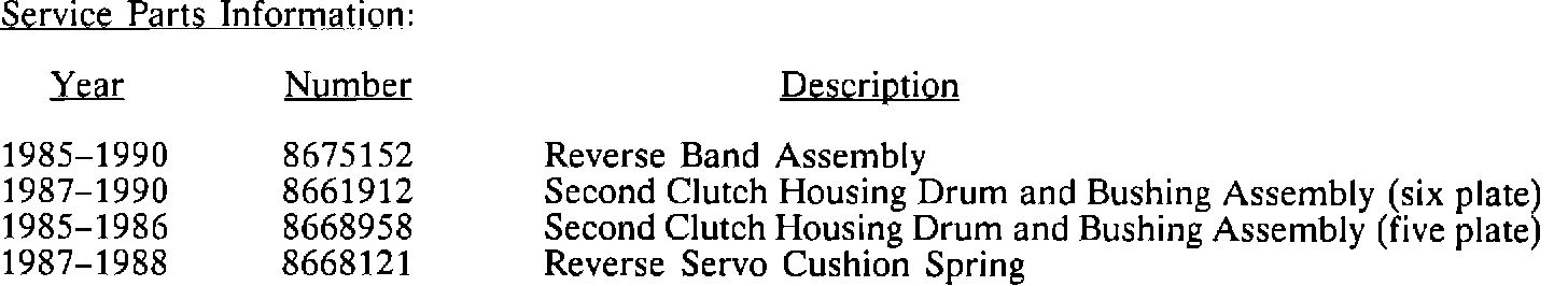 Beginning February 7, 1990 (Julian Date 038) all Hydra-Matic 4T60 (THM 440-T4) transaxles were built with the new reverse band assembly.