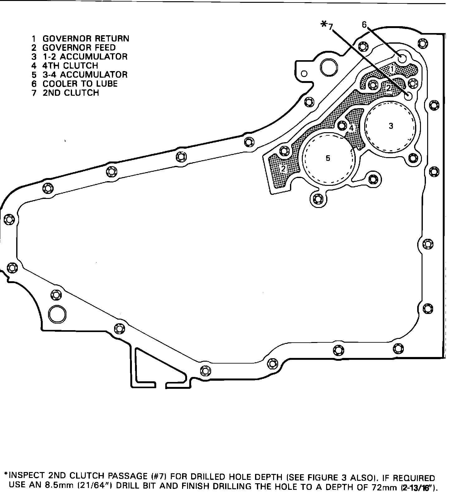 To repair this condition inspect the 2nd feed passage for blockage or incomplete drilling operation. To perform this inspection, remove the transaxle oil pan, filter, accumulator cover (with feed pipes and retainer), accumulator cover spacer plate, and gaskets (Figure 1). Inspect the 2nd clutch passage by measuring the depth of the hole, which should be a minimum of 72 mm (2-13/16") as shown in Figures 2 and 3. If the 2nd clutch passage is properly drilled, refer to Section 7A1 of the appropriate Service Information Manual for possible causes of a harsh 1-2 shift.