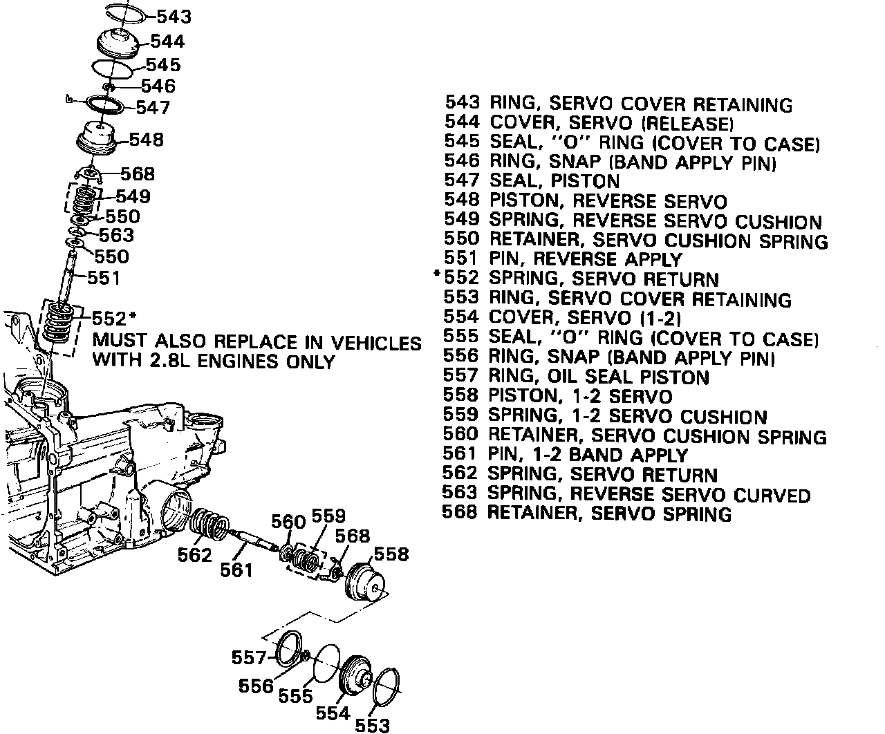 2. Disassemble and replace the 1-2 servo cushion spring (559), P/N 8668123, and the reverse servo cushion spring (549), P/N 8668121, (refer to Figure 1).