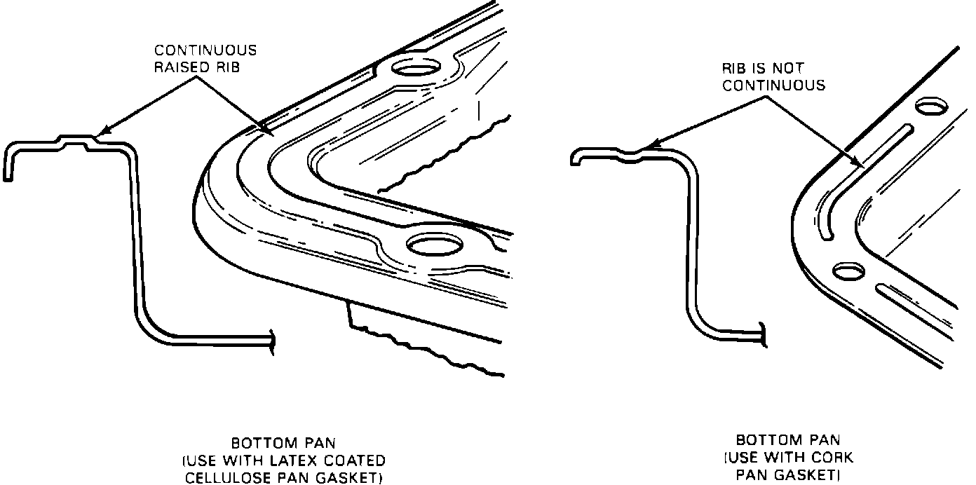 IMPORTANT: The new bottom pan must be used with the new gasket. If the previous design pan is used with the new gasket or the new design pan is used with a cork gasket, fluid leaks may develop.