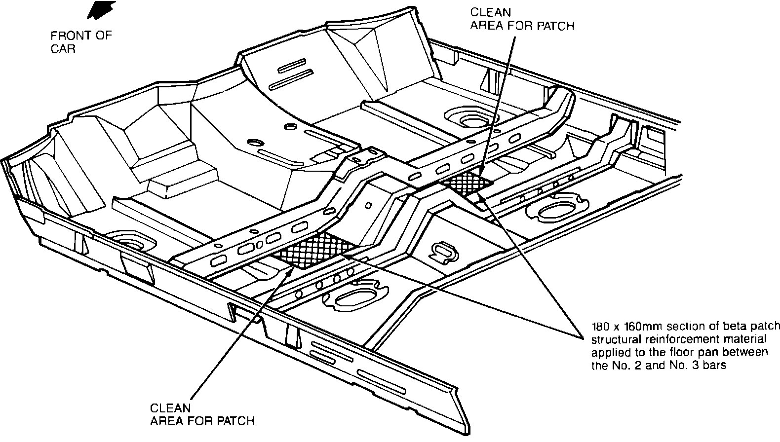 A. Clean the floor pan surface in between the floor pan bars; center tunnel and outboard longitudinal depression. Refer to Figure 1. Remove any dirt, grease, or oil.