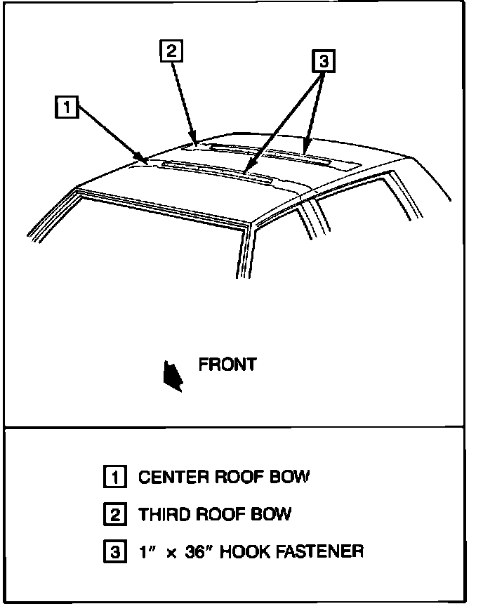2. Bond a 1" wide by 36" long strip of Velcro(R) hook material the full length of center and third roof bow using 3M 08046 top and trim adhesive, 08090 super trim adhesive, 08001 super weatherstrip adhesive, or equivalent. Refer to Figure 1.