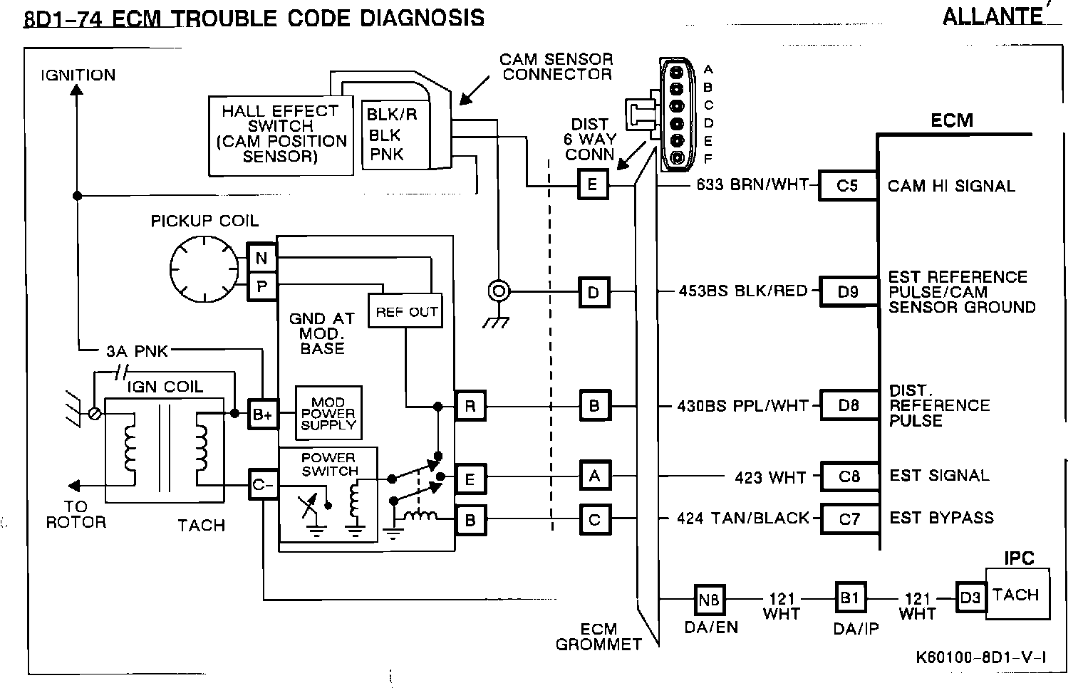 DESCRIPTION: The cam sensor is located on the distributor shaft and provides one pulse per rotation of the distributor. The ECM uses the cam sensor signal to know the location of the camshaft for proper fuel distribution. Code E041 sets when the ECM knows the engine is turning (reference pulses being received on CKT 430) and does not detect any cam sensor pulses.