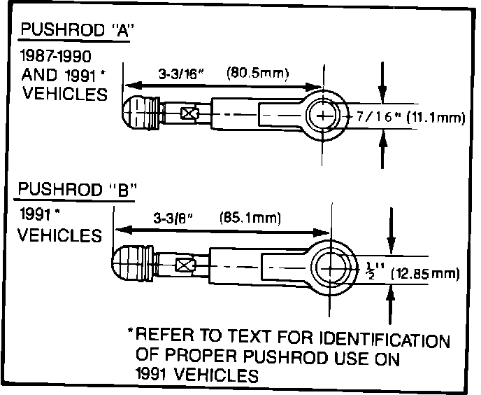 The service ABS hydraulic unit assembly, P/N 3527782, is supplied with two pushrods. The pushrods differ in length and hole diameter. 1987-1990 Allantes have hydraulic unit assemblies with Pushrod "A". A quantity of 1,630 1991 Allantes are also equipped with Pushrod "A" as a carryover from 1990. The balance of 1991 vehicles are equipped with Pushrod "B". Refer to Figure 1.