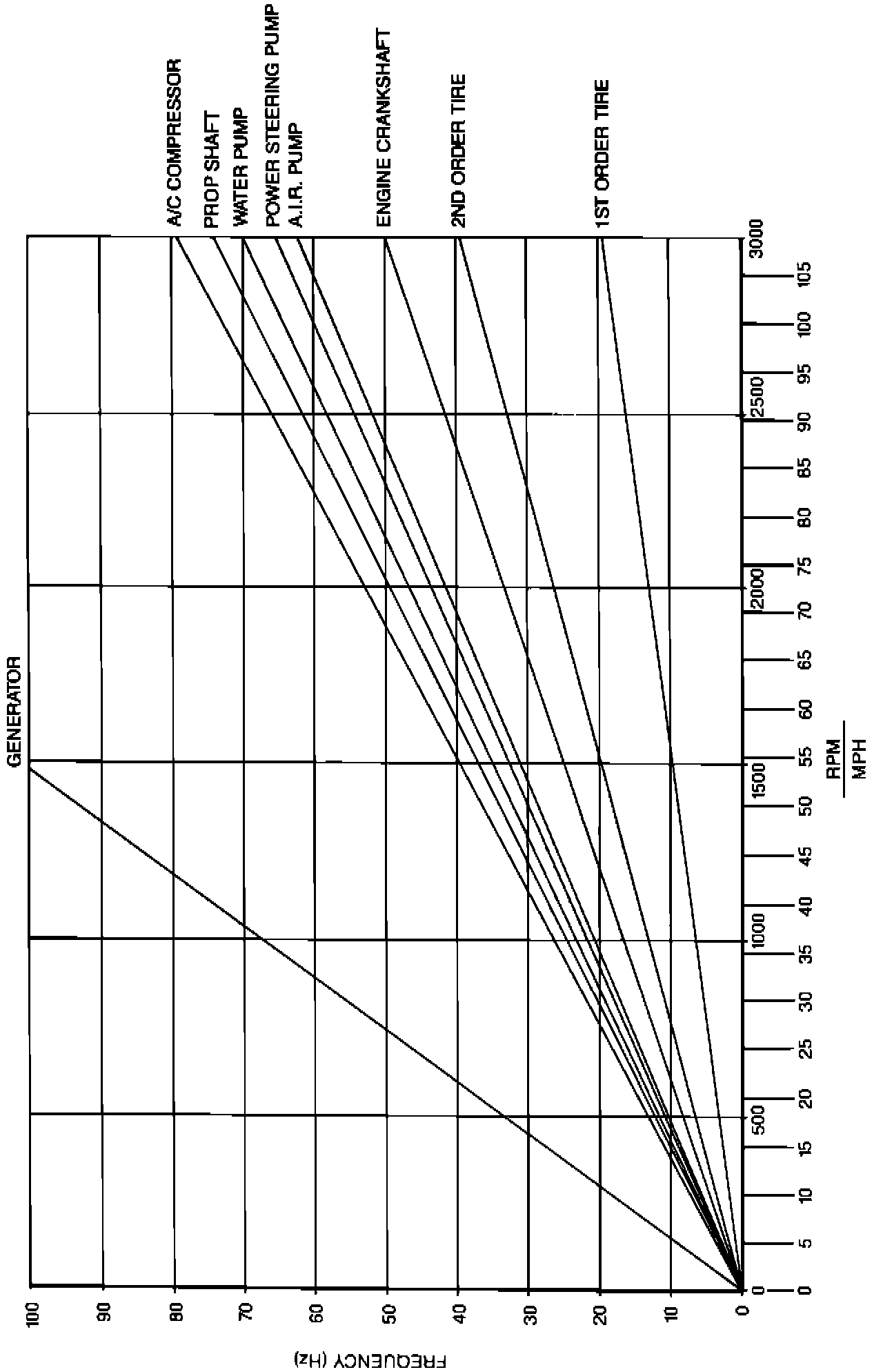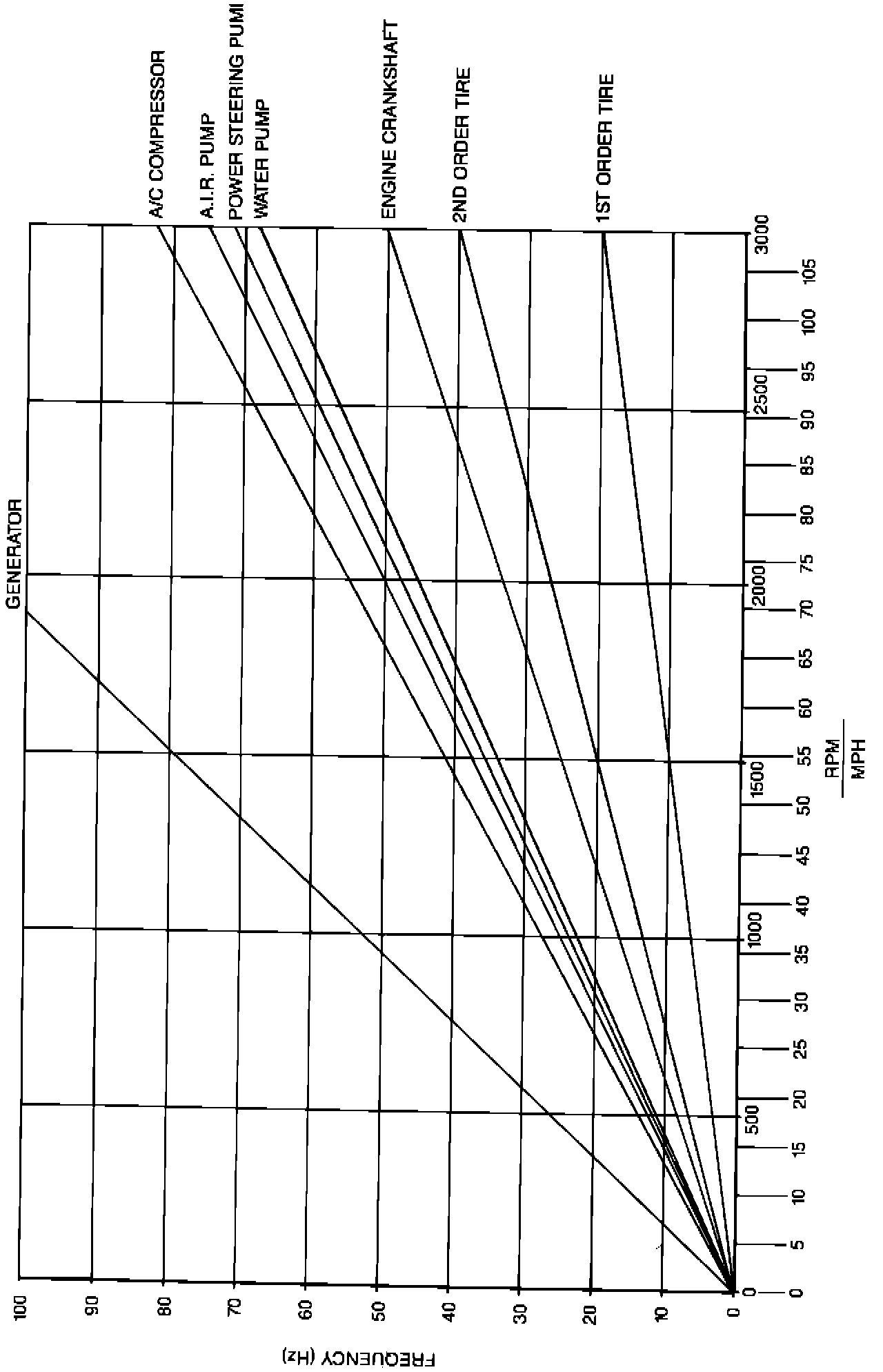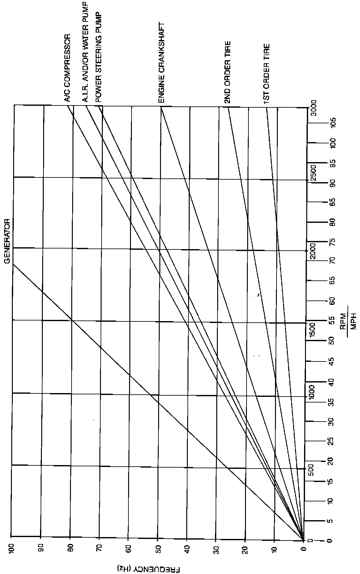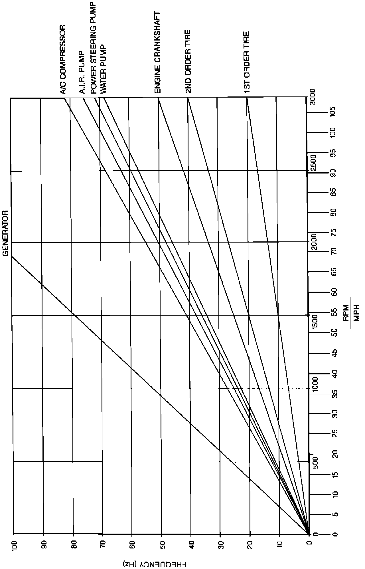 RPM VS. MPH IS AN APPROXIMATION ONLY THIS RELATIONSHIP MAY VARY FROM VEHICLE TO VEHICLE OR UNDER DIFFERENT DRIVING CONDITIONS. THEREFORE, USE THE MPH SCALE FOR ROAD SPEED SENSITIVE ITEMS (I.E. TIRES) AND USE THE RPM SCALE FOR ENGINE SPEED SENSITIVE ITEMS (I.E. GENERATOR, A/C COMPRESSOR, AIR PUMP STEERING PUMP WATER PUMP AND CRANKSHAFT).