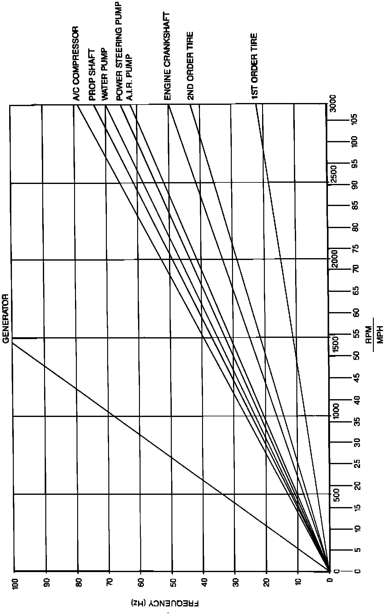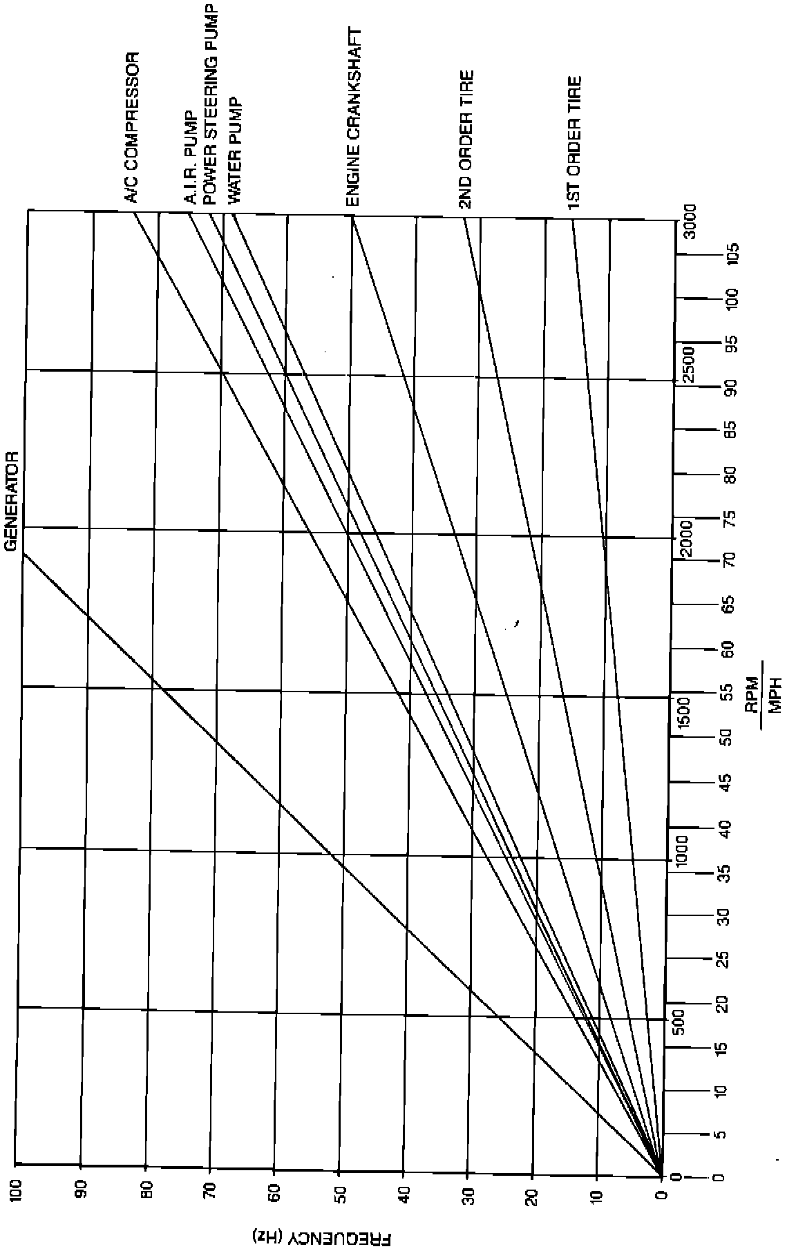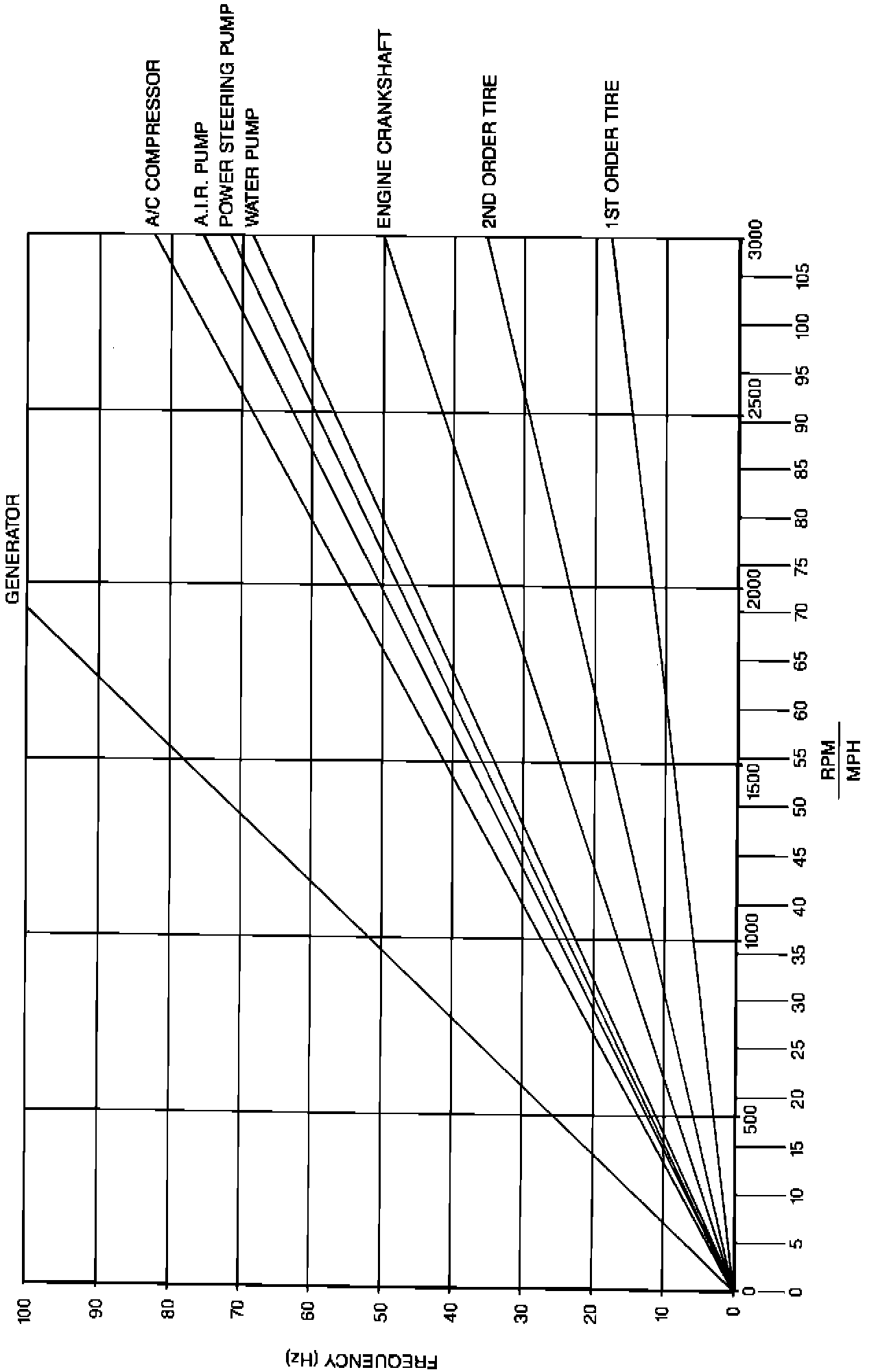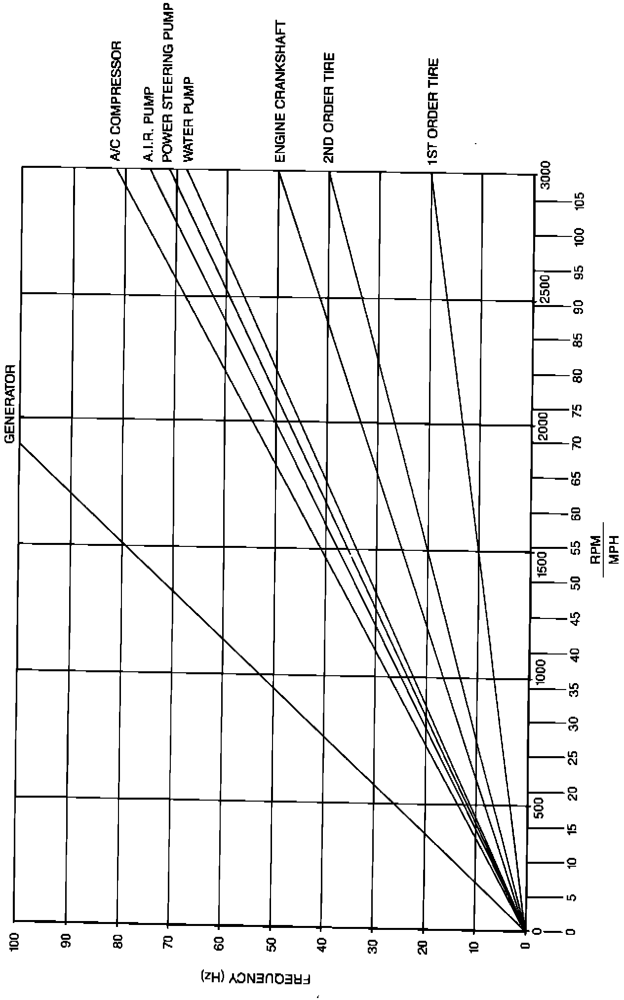 RPM VS. MPH IS AN APPROXIMATION ONLY THIS RELATIONSHIP MAY VARY FROM VEHICLE TO VEHICLE OR UNDER DIFFERENT DRIVING CONDITIONS. THEREFORE, USE THE MPH SCALE FOR ROAD SPEED SENSITIVE ITEMS (I.E. TIRES) AND USE THE RPM SCALE FOR ENGINE SPEED SENSITIVE ITEMS (I.E. GENERATOR, A/C COMPRESSOR, AIR PUMP STEERING PUMP WATER PUMP AND CRANKSHAFT).