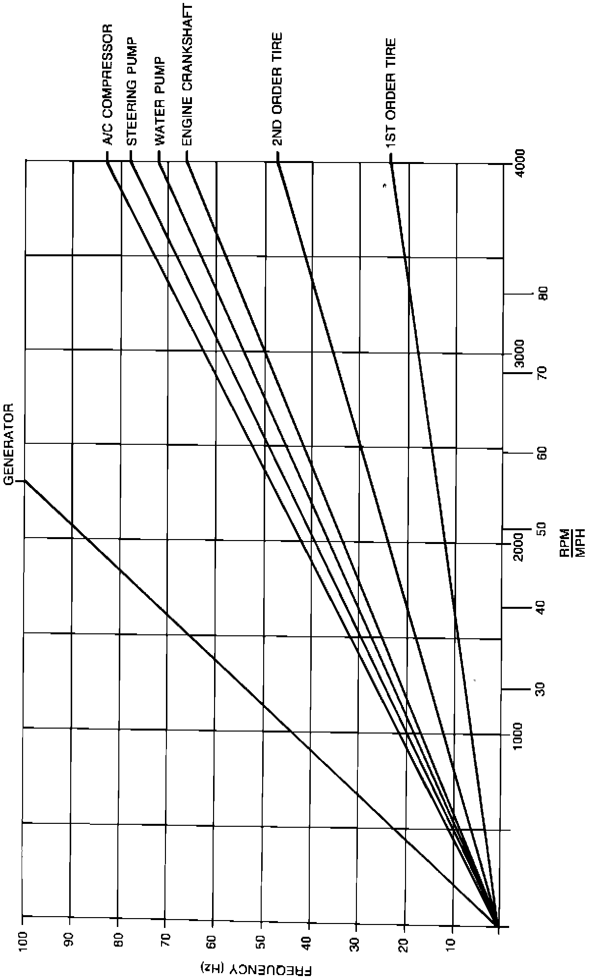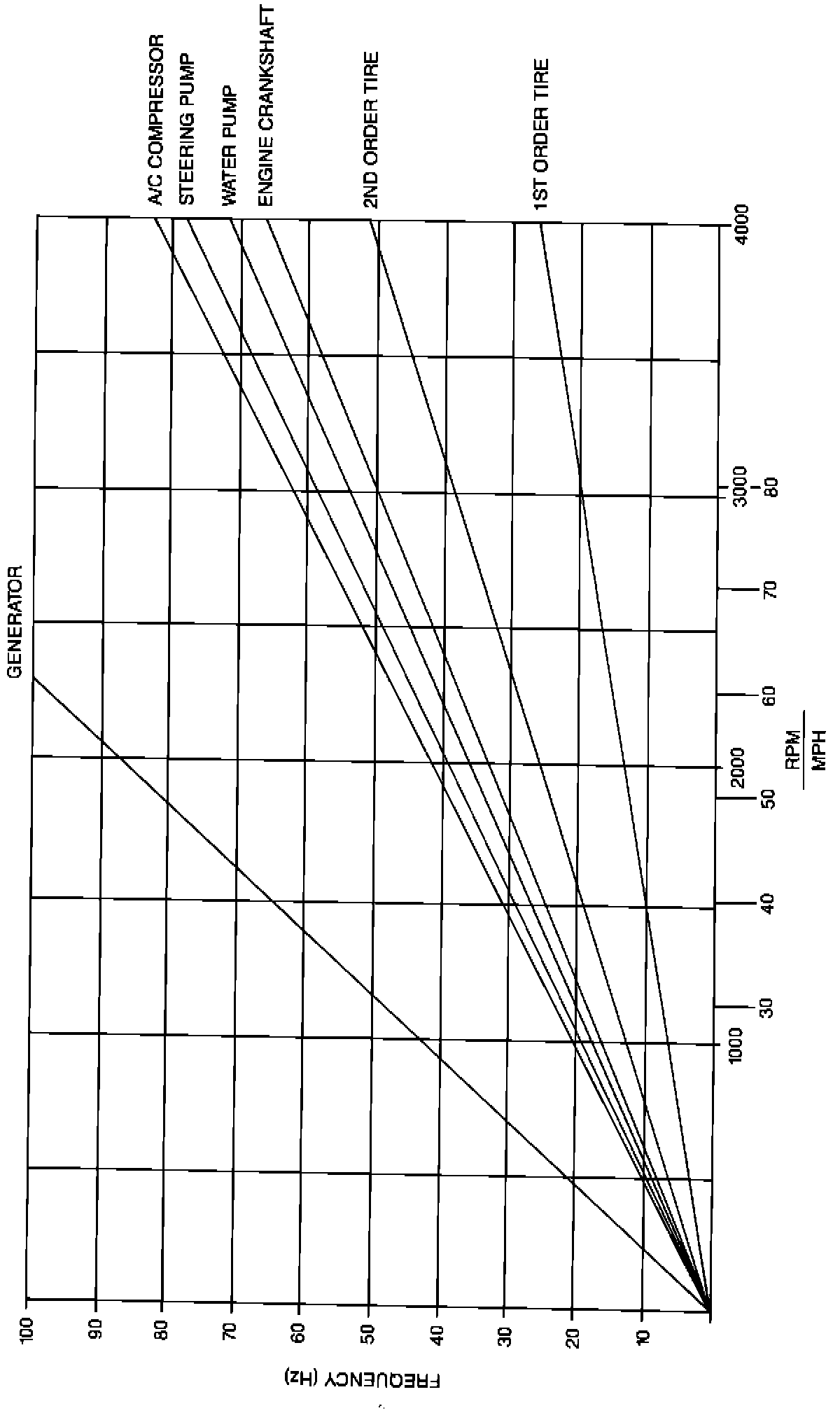 RPM VS. MPH IS AN APPROXIMATION ONLY. THIS RELATIONSHIP MAY VARY FROM VEHICLE TO VEHICLE OR UNDER DIFFERENT DRIVING CONDITIONS. THEREFORE, USE THE MPH SCALE FOR ROAD SPEED SENSITIVE ITEMS (I.E. TIRES) AND USE THE RPM SCALE FOR ENGINE SPEED SENSITIVE ITEMS (I.E. GENERATOR, A/C COMPRESSOR, AIR PUMP, STEERING PUMP, WATER PUMP, AND CRANKSHAFT).