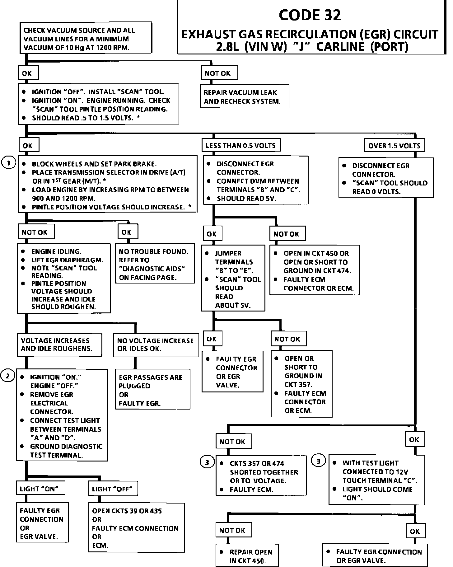 Circuit Description: 2.8L (VIN W) "J" CARLINE (PORT) The integrated electronic EGR valve functions similar to a port EGR valve with a remote vacuum regulator. The internal solenoid is normally open, which causes the vacuum signal to be vented "OFF" to the atmosphere when EGR is not being commanded by the ECM. This EGR valve has a sealed cap and the solenoid valve opens and closes the vacuum signal which controls the amount of vacuum vented to atmosphere, and this controls the amount of vacuum applied to the diaphragm. The electronic EGR valve contains a voltage regulator which converts the ECM signal to provide different amounts of EGR flow by regulating the current to the solenoid. The ECM controls EGR flow with a pulse width modulated signal (turns "ON" and "OFF" many times a second) based on air flow, TPS, and rpm. This system also contains a pintle position sensor which works similar to a TPS sensor, and as EGR flow is increased, the sensor output also increases. Code 32 means that there has been an EGR system fault detected, Code 32 will set under two conditions: