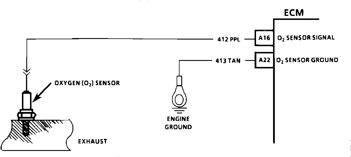 The ECM supplies a voltage of about .45 volt between terminals "A16" and "A22". (If measured with a 10 megohm digital voltmeter, this may read as low as .32 volt.) The O2 sensor varies the voltage within a range of about 1 volt if the exhaust is rich, down through about .10 volt if exhaust is lean. The sensor is like an open circuit and produces no voltage when it is below about 315~C (600~F). An open sensor circuit or cold sensor causes "Open Loop" operation.