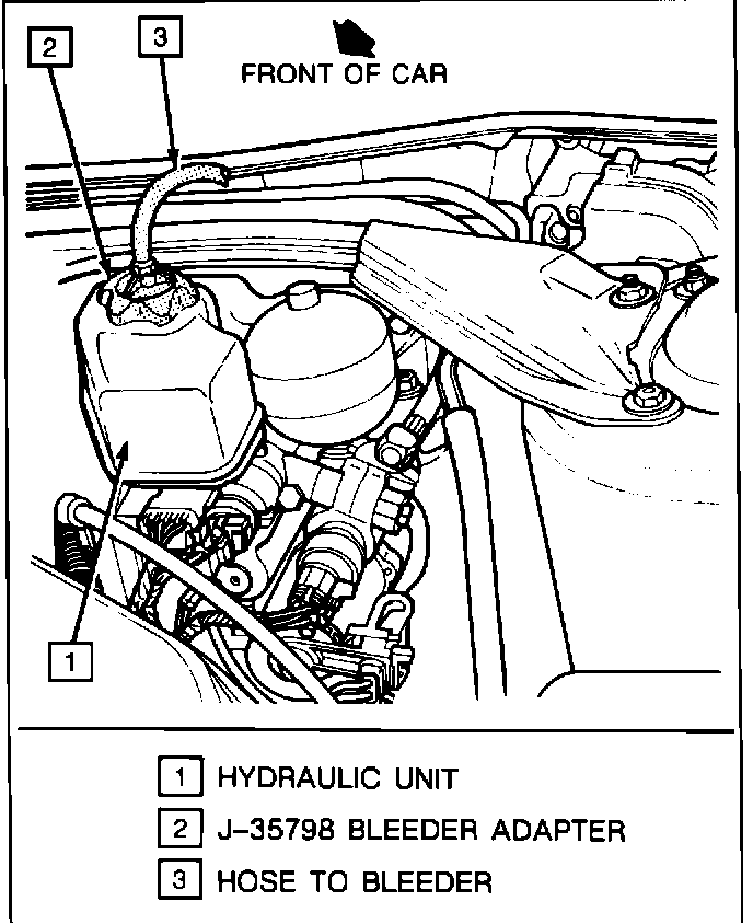 3. If the pump has not stopped after 60 seconds, turn ignition OFF and remove reservoir cap. Install pressure bleeder adapter, J-35798, as shown in Figure 1.