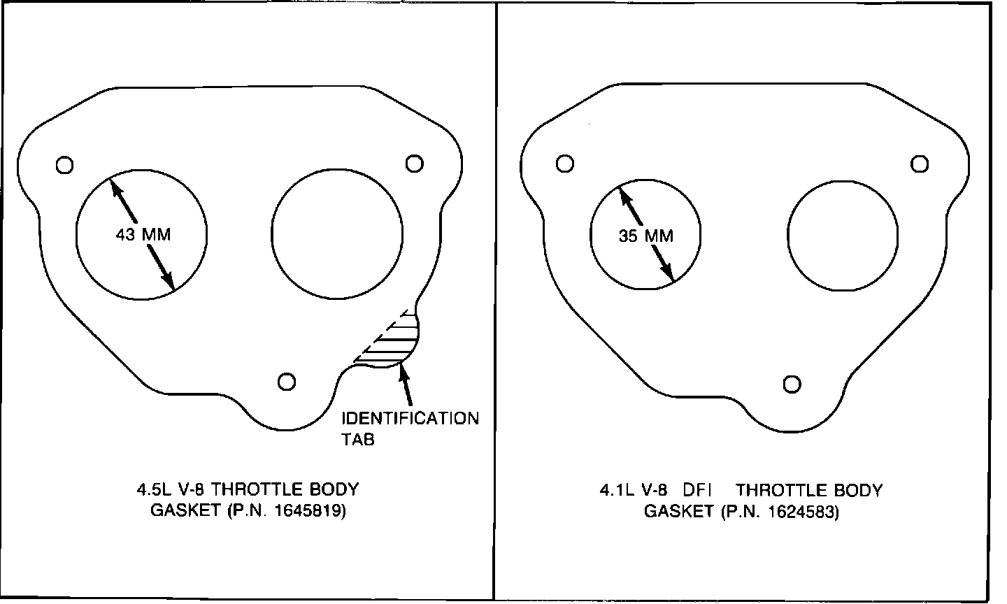 With the introduction of the 4.5L V-8 engine for the 1988 model year, revisions in the throttle body bore diameter have dictated changes in the throttle body to intake manifold gasket. The diameter has changed from 35 mm for the 4.1L V-8 gasket to 43 mm on the 4.5L V-8 (see Figure 1).