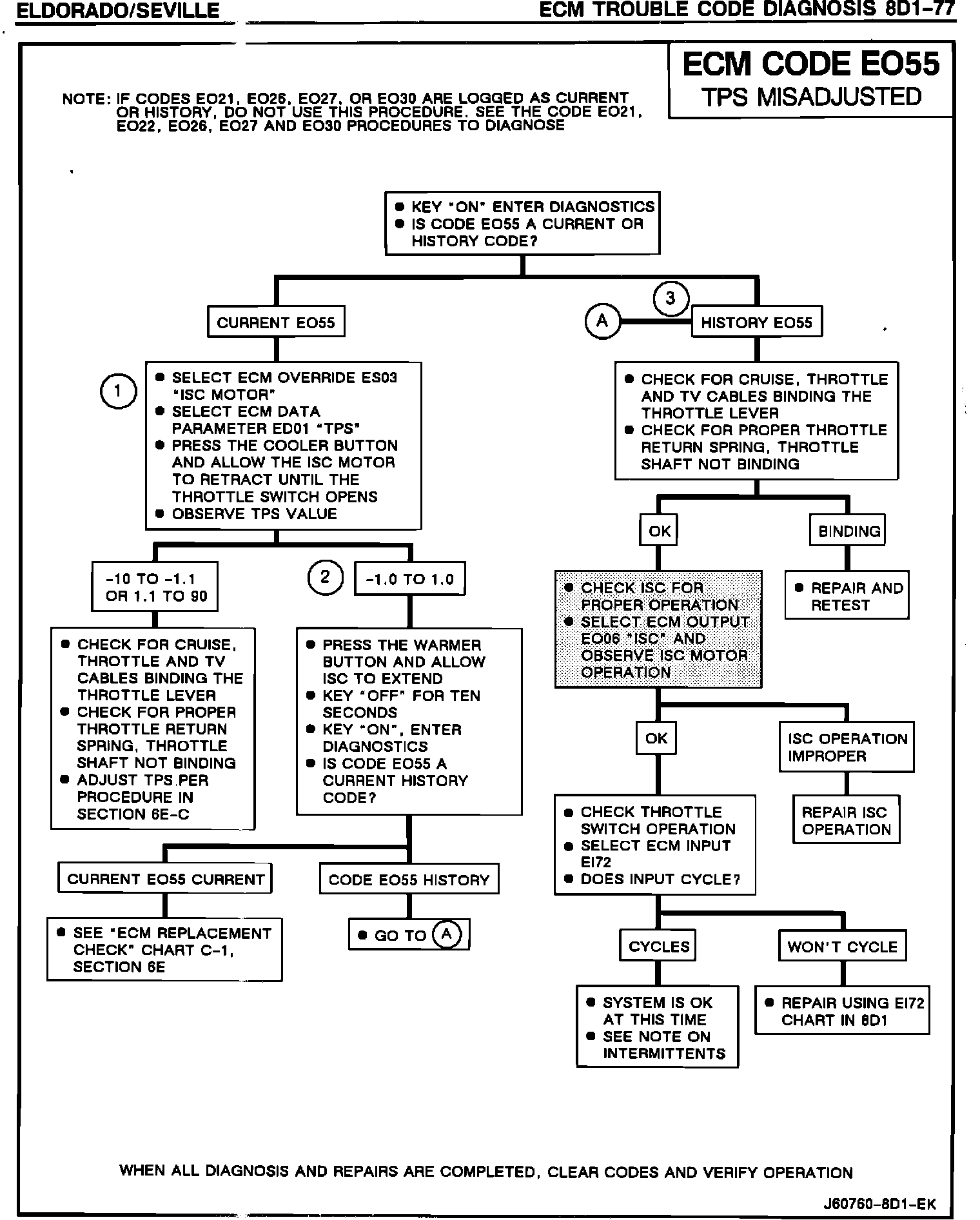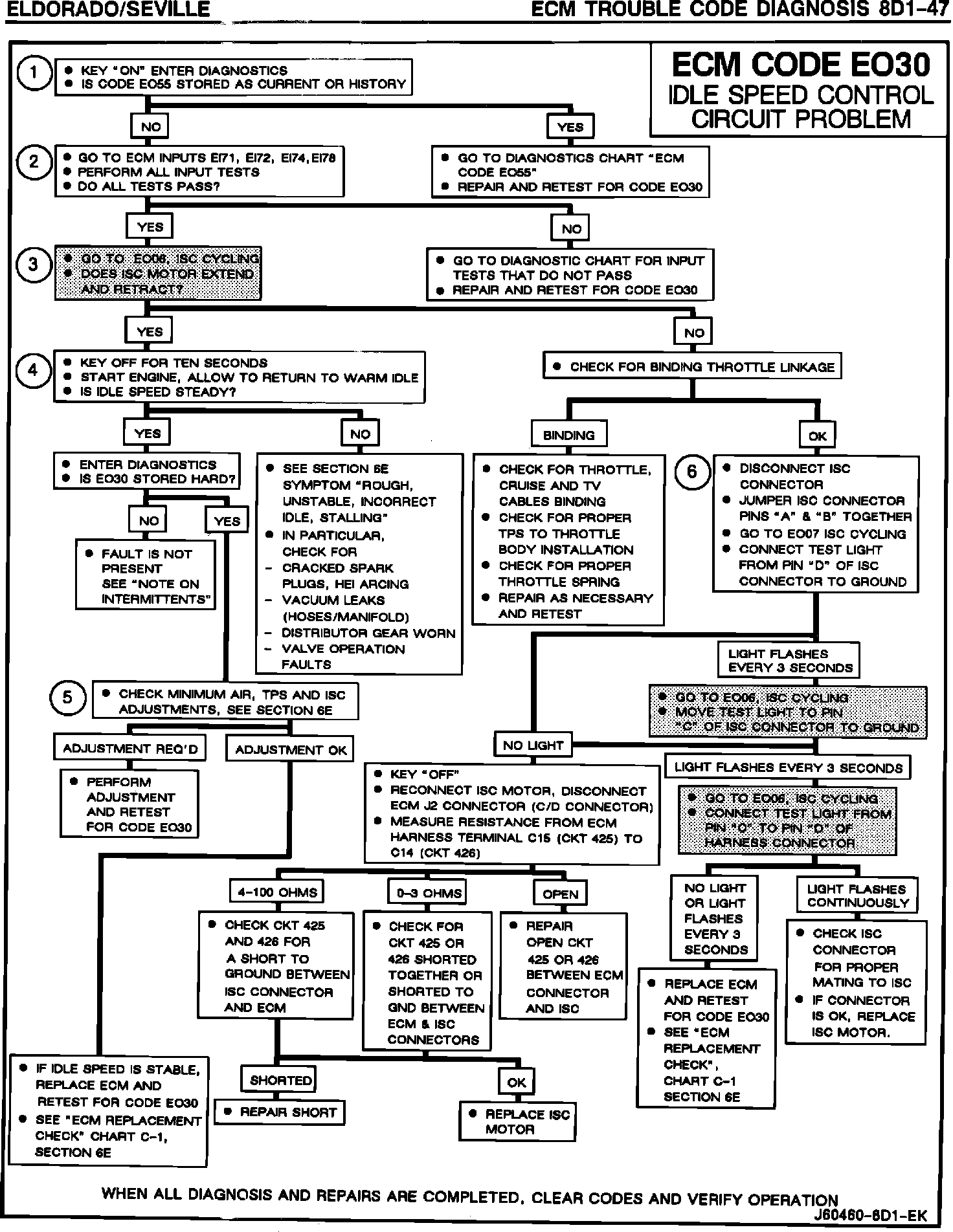 NOTE: The diagnostic chart for ECM code E030, Idle Speed Control Problem, on page 8D1-47 of the 1988 Eldorado/Seville Service Information Manual, directs you in several places to "Go to E007, ISC Cycling". This should read "Go to E006, ISC Cycling". Additionally, the diagnostic chart for ECM code E055, TPS Misadjusted, on page 8D1-77, directs you to "Select ECM Output E007". This should read "Select ECM Output E006". Revised diagnostic charts are attached. Please note these changes in your copy of the Service Information Manual.