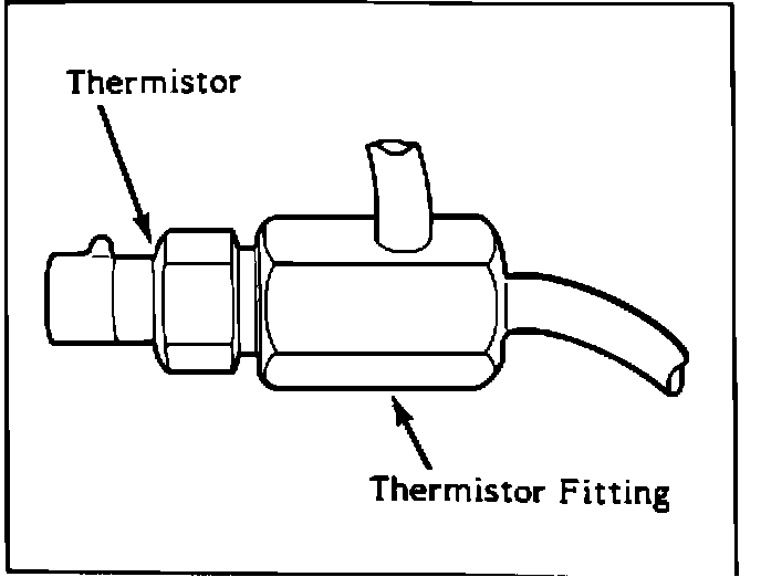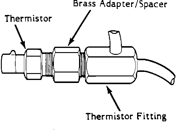 3. Install the brass adapter/spacer (Part Number 444002) into the thermistor fitting and install the thermistor into the adapter/spacer. (Refer to illustration #2). Use a light application of thread sealant if needed to prevent leaks. Do not overtighten.