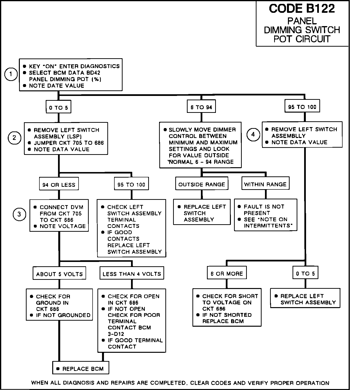 Code B122 will set if the ignition is on and the signal voltage indicates less than 6% (open or grounded CKor over 94% (shorted to voltage). During the time the failure is present a substitute dimming value will be implemented to allow continued operation of interior lighting. The reading from the potentiometer BD42 however, will display the actual sensor reading.