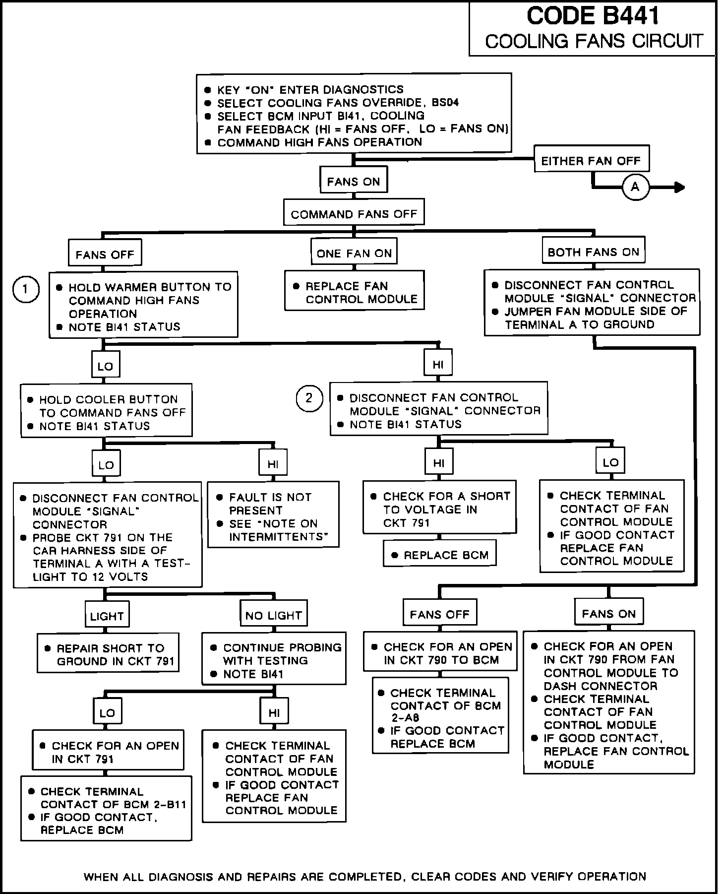 2. The cooling fans feedback input B141 can be used to evaluate the feedback signal being received by the BCM. If the input does not agree with the actual fans operation, circuit 791 must be investigated for a possible malfunction. If the input does agree with the commanded fans operation within the appropriate time period, then the cause of code B441 is not currently present.