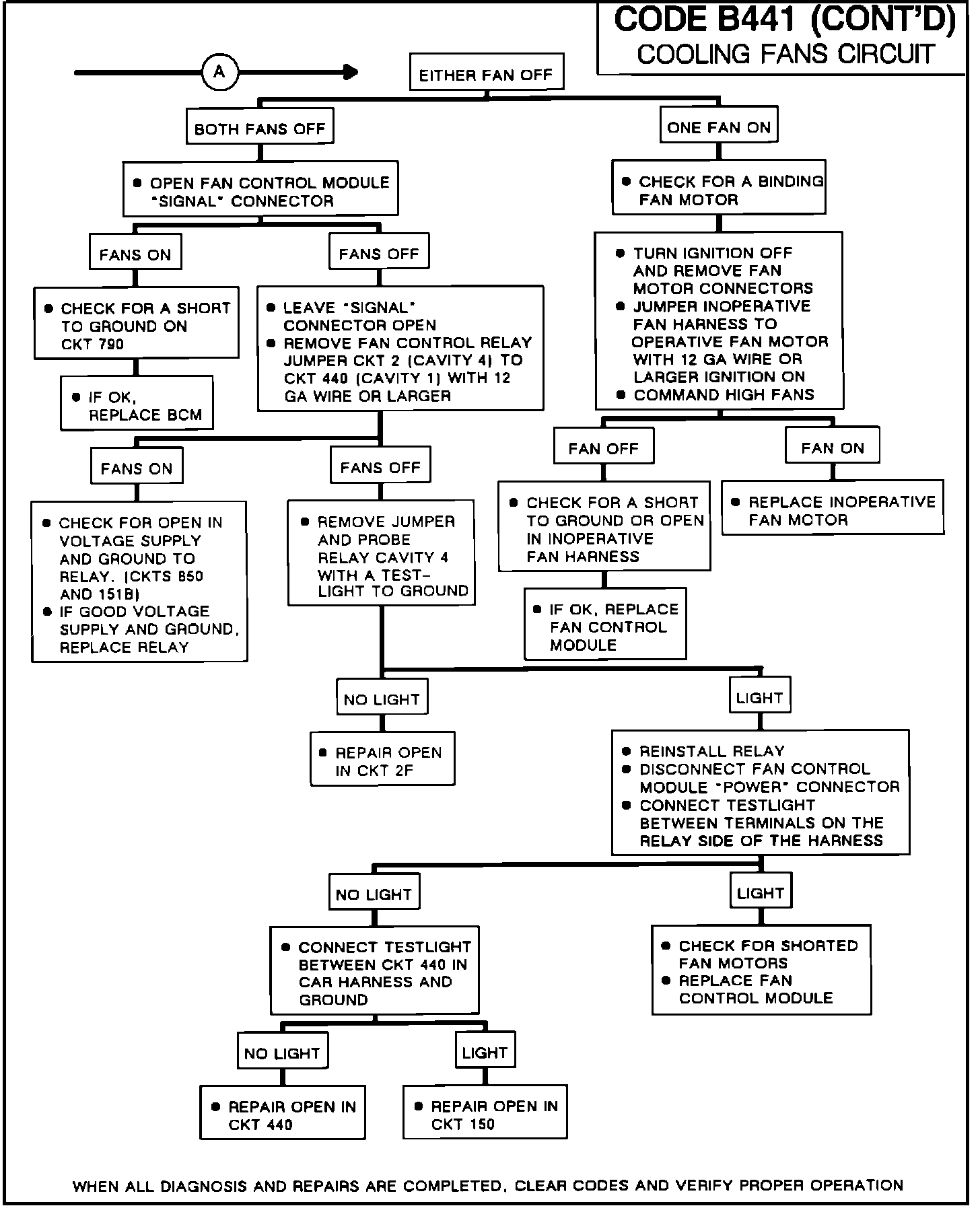 If an intermittent code B441 is being set, manipulate the related wiring while observing the cooling fans feedback B141 and commanding "High Fans" or "Fans Off" in the override diagnostic mode. If the failure is induced, the fans status will not agree with the commanded operation. This will help in isolating the location of the malfunction.