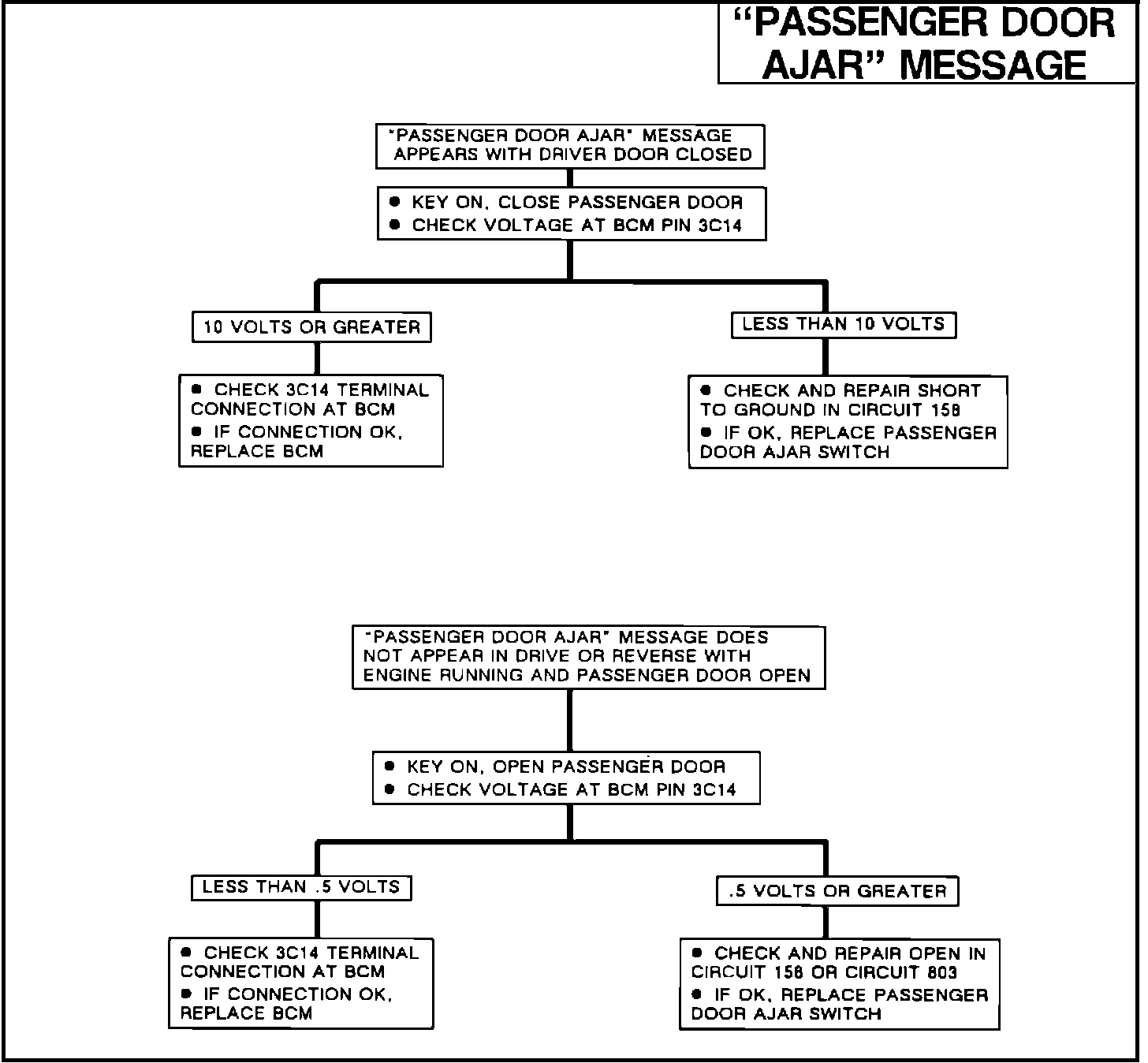 Display the "Passenger Door Ajar" message on the CCDIC. The BCM provides system voltage to the passenger door ajar circuit, and the passenger door ajar switch provides the single path to ground. The BCM supplies and internally monitors the voltage level of circuit at pin 3C14. When the passenger door ajar circuit is open the BCM will detect system voltage, but if the passenger door ajar switch provides a path to ground (passenger door open), the BCM will detect that the circuit has been grounded. Once the BCM has determined that all of the failure conditions have been met, it will send the "Passenger Door Ajar" message to the CCDIC.