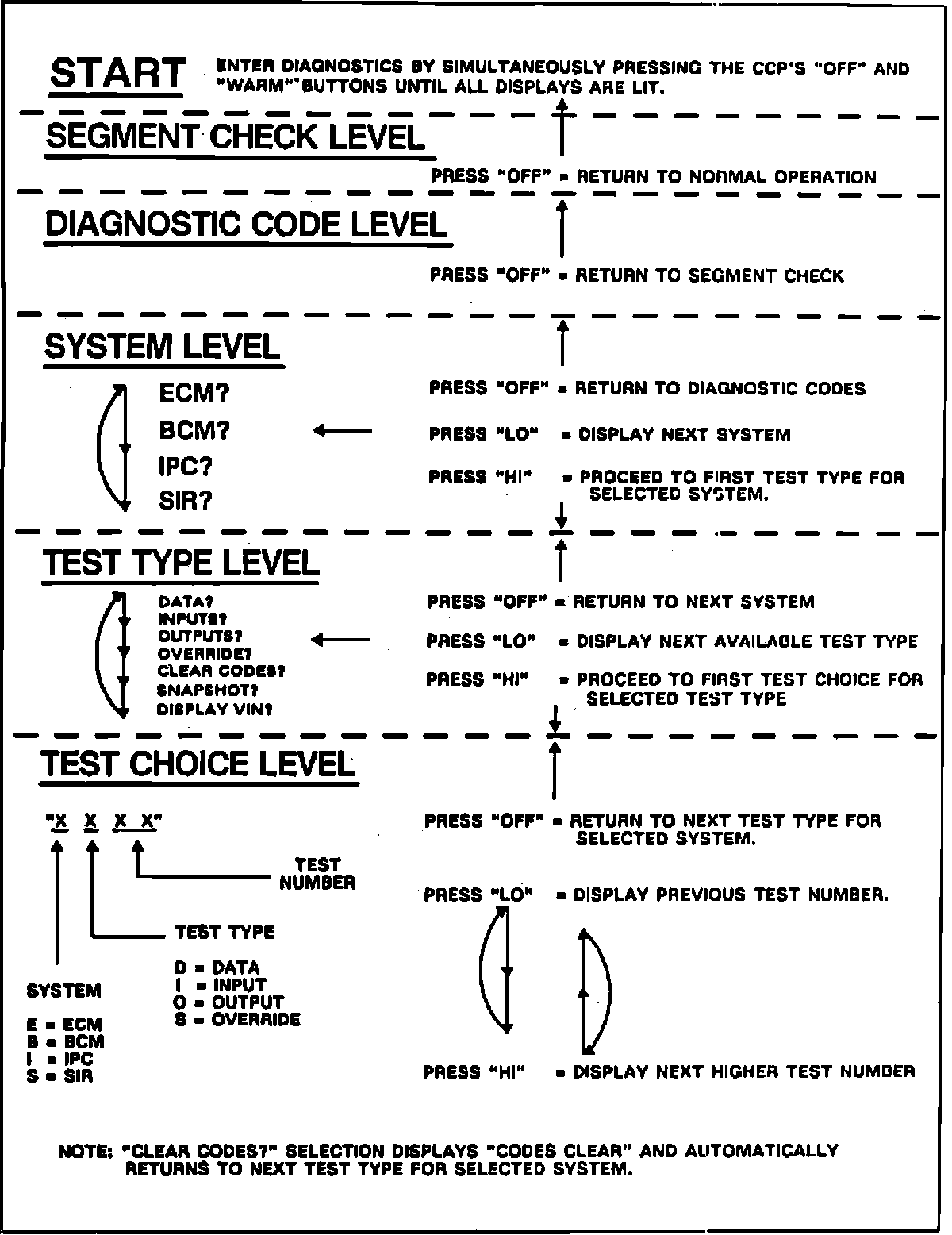 4. Depress Hi button on the CCP. This will displayed the first test type. At this point, press Hi button until the correct test type appears as listed below under the applicable model year.