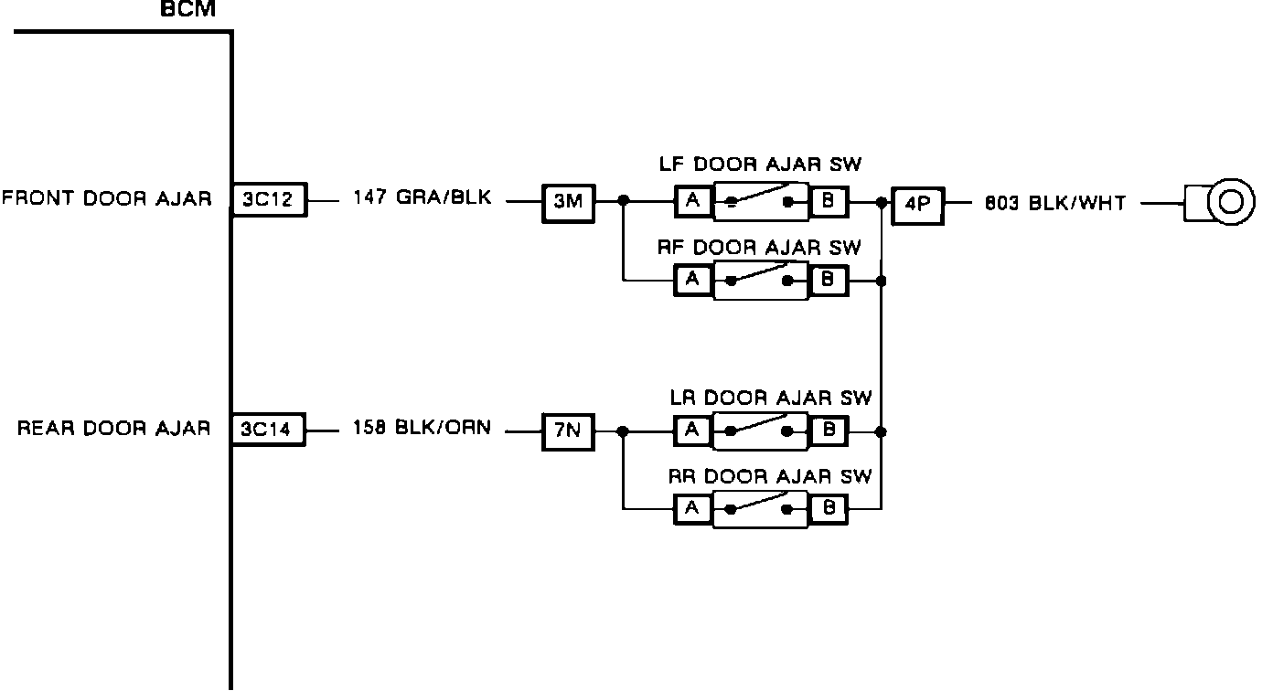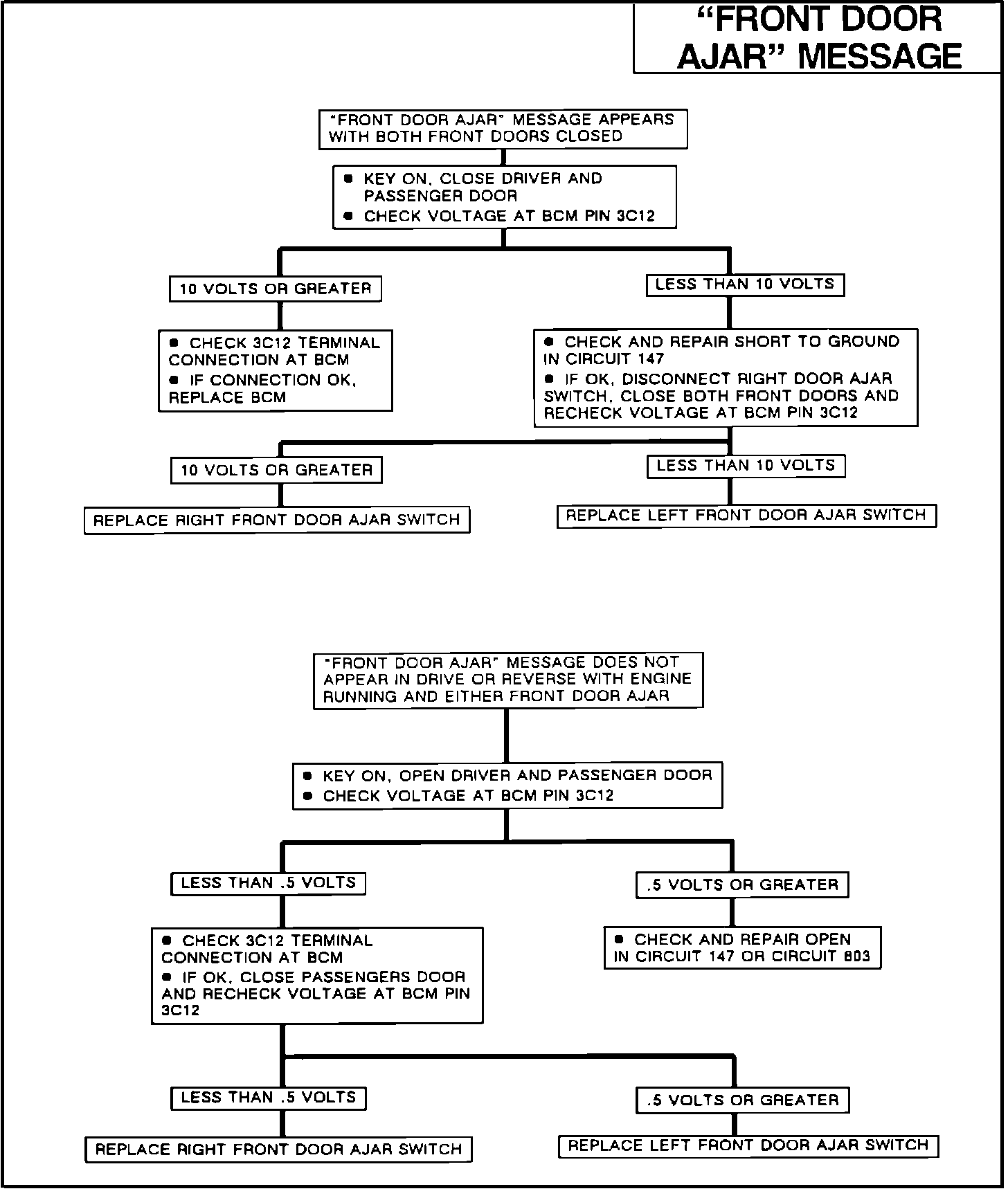 Display the "Front Door Ajar" message on CCDIC. The BCM provides system voltage to the front door ajar circuit, and the left hand and right hand front door ajar switches provide two separate paths to ground. The BCM internally monitors the voltage level at pin 3C12. When the front door ajar circuit is open the BCM will detect system voltage, but if one or both switches provide a path to ground (either front door is open), the BCM will detect the circuit has been grounded. Once the BCM detects that all of the failure conditions have been met, it will send the "Front Door Ajar" message to the CCDIC.