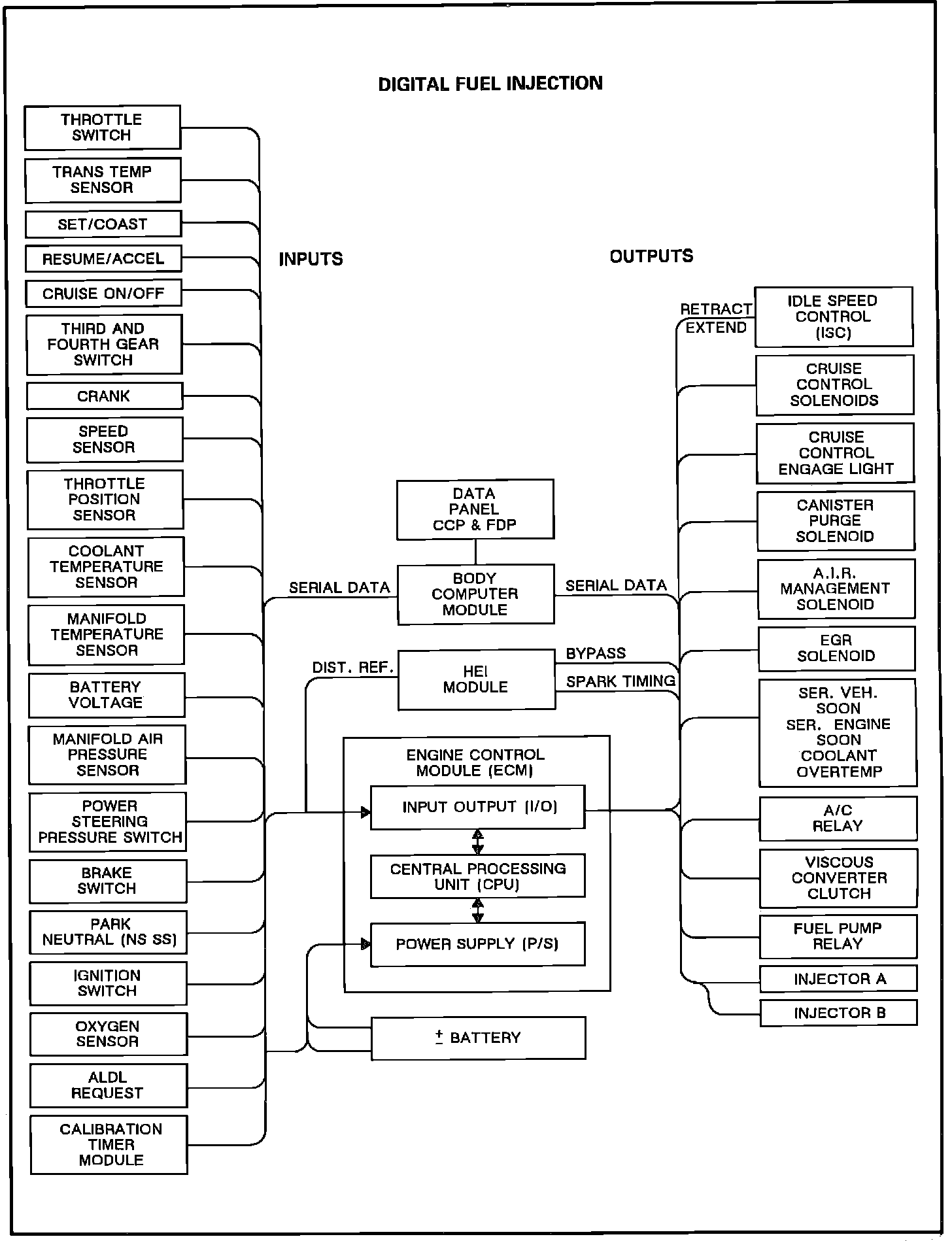 This vehicle uses several electronic components which form an electronic computer network, designed to control various engine and body sub-systems. The heart of the computer network is the Body Computer Module (BCM). The BCM has an internal microprocessor which is the center for communication with all the other components, and controls the on-board diagnostics of the vehicle. All system sensors and switches are monitored by the BCM or one of the four other major components that complete the computer system network. The other four components are the Climate Control Driver Information Center (CCDIC), Electronic Control Module (ECM), HVAC Programmer, and the Instrument Panel Cluster (IPC).