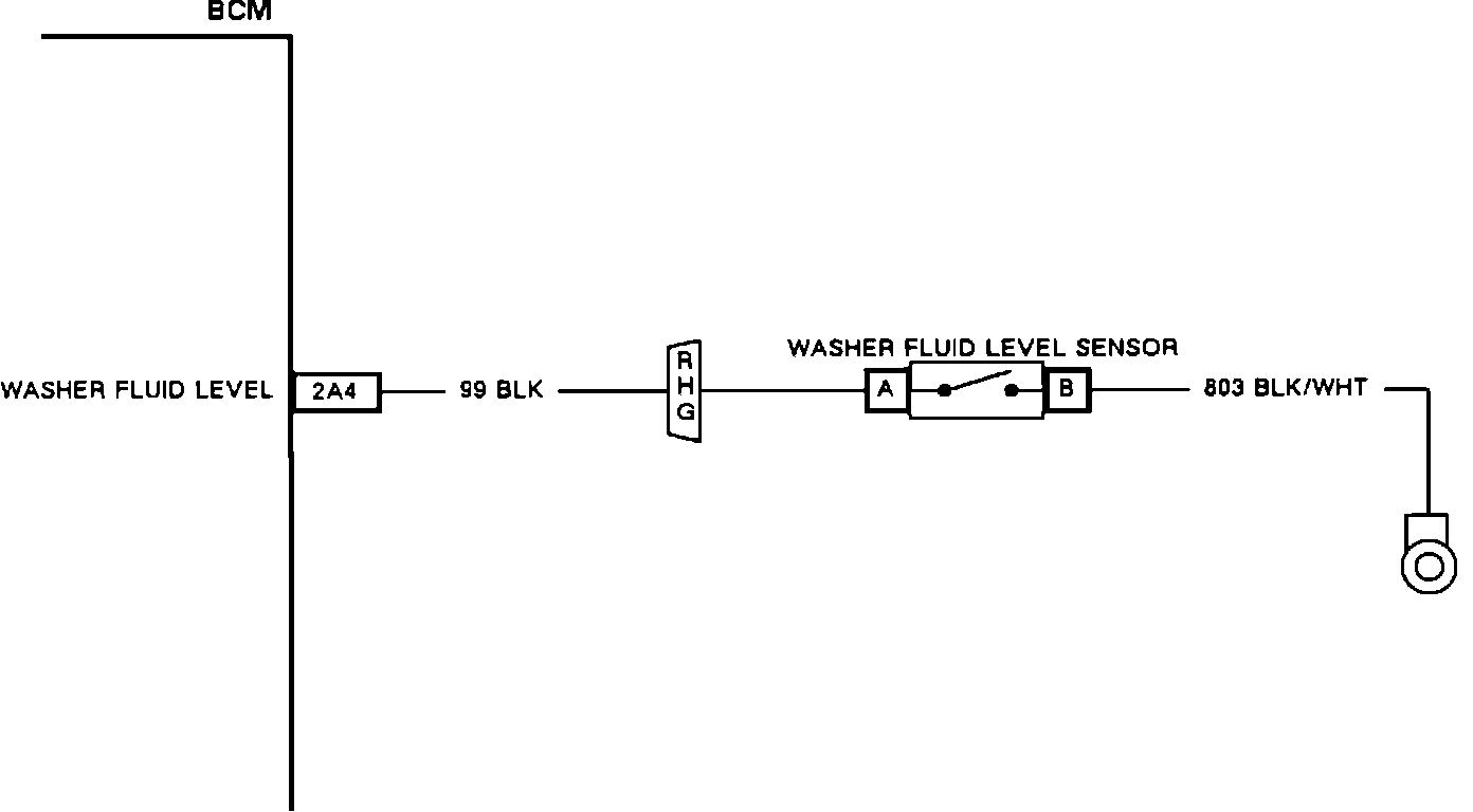 The BCM provides system voltage to the low washer fluid circuit. and the washer fluid level switch provides the single path to ground. The BCM supplies and internally monitors the voltage level of the circuit at pin 2A4. When the washer fluid level circuit is open the BCM will detect system voltage, but if the washer fluid level switch provides a path to ground (low washer fluid condition present), the BCM will detect low voltage. If this condition exists for at least 15 seconds, the BCM will send the "Washer Fluid Low" message to the CCDIC.