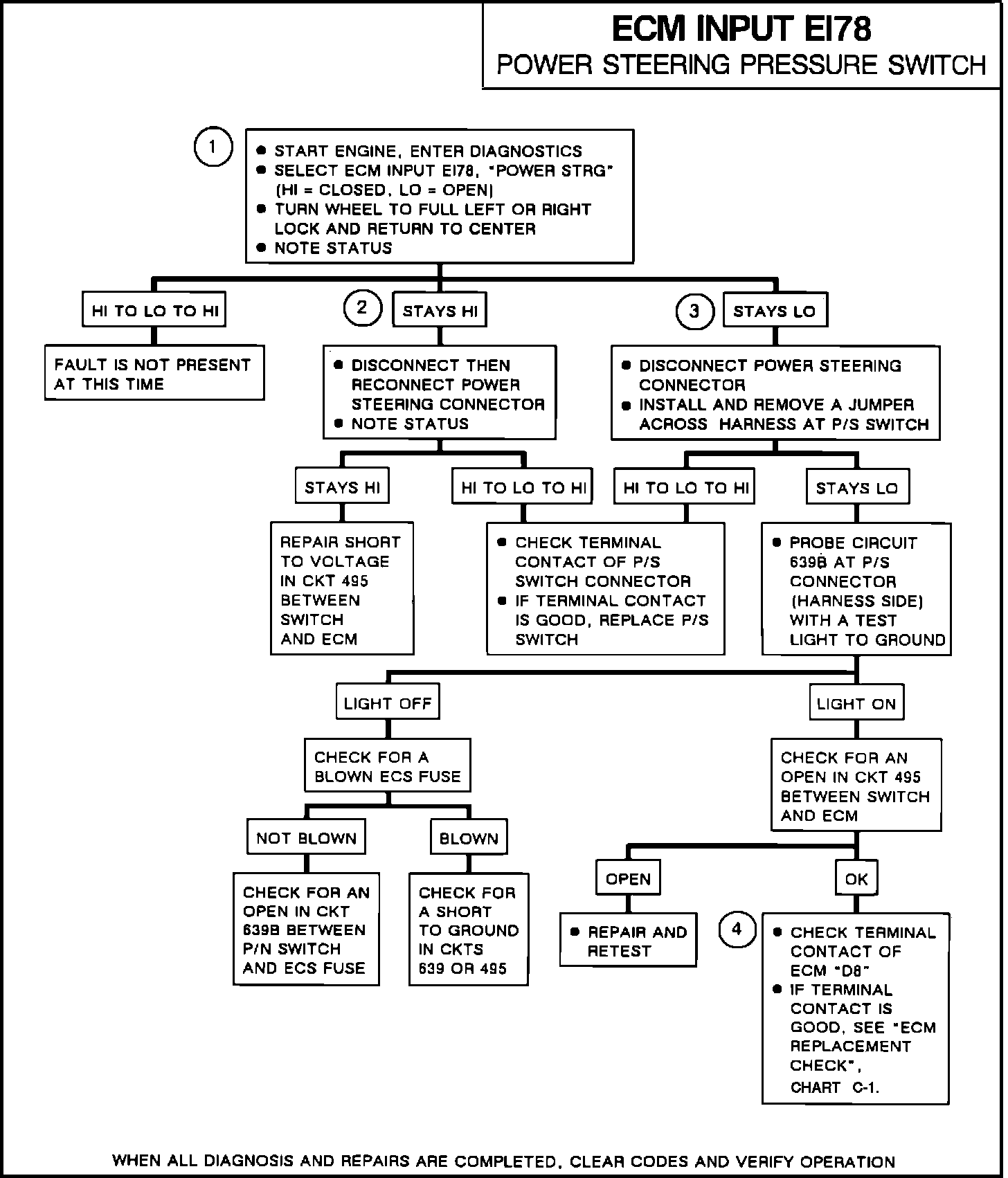 At key on, engine off, manipulate power steering switch connector and related wiring while observing ECM Input "EI78". If EI78 cycles to "LO" at any time, repair source of intermittent open.