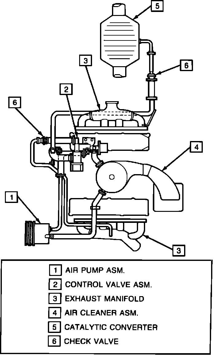 An air Injection Reaction (AIR) system is used to provide additional oxygen to the exhaust stream outside of the combustion chamber. The additional oxygen allows the combustion process to continue to help reduce exhaust emissions. The AIR system uses an engine driven pump to inject air into either the exhaust manifold, the catalytic converter, or the air cleaner. The AIR system includes an Air Pump, two Check Valves, a Control Valve Assembly, and all necessary plumbing.