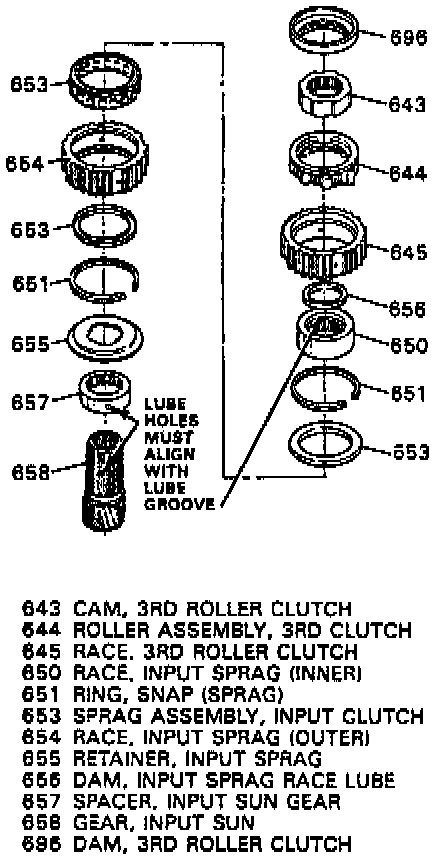 43. Remove 3rd roller clutch and input sprag from input sun gear, Fig. 37, then the input sun gear spacer and retainer from sun gear.