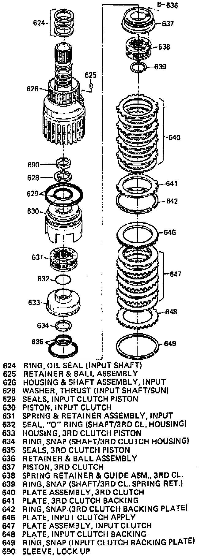 Fig. 41, Exploded view of input clutch assembly. 1988-90 units: