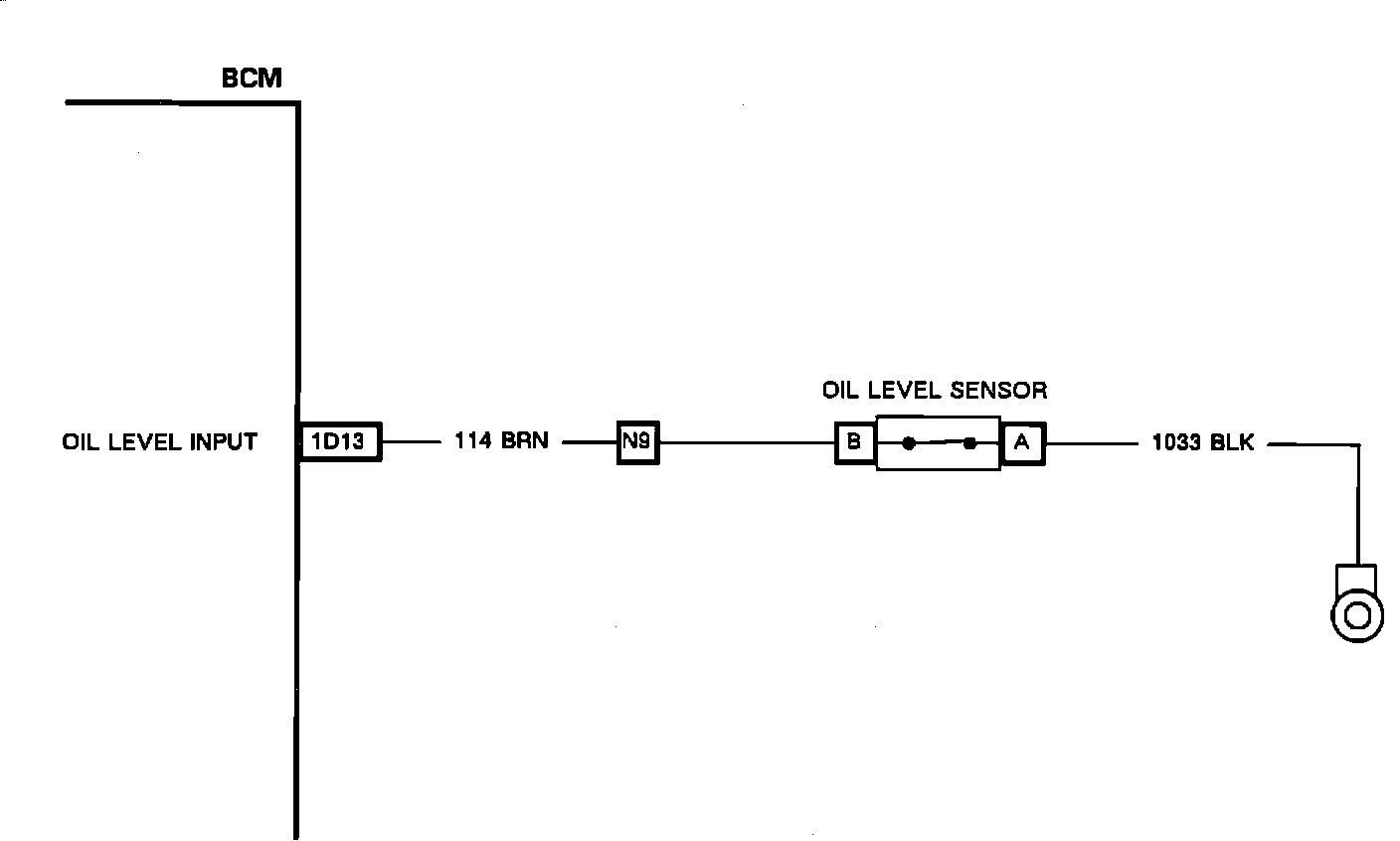 The BCM monitors the engine oil level through the oil level sensor input, pin 1D13. The oil level sensor is a magnetic switch that is closed with normal oil level and opens with low oil level. When the switch is closed, the BCM will see a low voltage on pin 1D13 and when the switch is open it will see a high voltage. The BCM will only check for a low oil level when it wakes up and sees a drop in coolant temperature of at least 15°C since the end of the previous ignition cycle. This is done to assure that the oil has had a chance to drain back into the oil pan so that a correct oil level reading may be made. If these conditions are met and the oil level input is high, indicating low oil level, the BCM will send the "Low Engine Oil" message to the DIC.