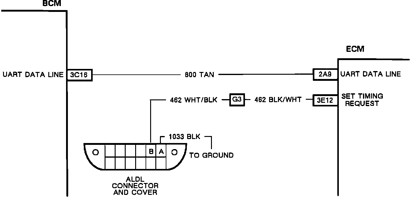 Set timing mode is a service aid designed into the fuel control system to allow spark advance to be disabled and engine timeing checked. If pin B of the ALDL connector is grounded, the PCM/ECM will sense a ground on circuit 462 and enter set timing mode as long as the engine is running, the transmission is in park or neutral, and the engine rpm is below 900. when these conditions are met, the ECM will indicate this to the BCM over the UART data line and the BCM will send the "Set Timing Mode" message to the CCDIC.