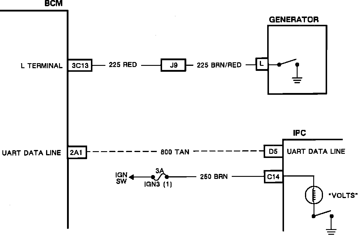 The BCM monitors the generator L-terminal input on pin 3C13. This input indicates whether the generator is charging or not. If the generator is not charging, it grounds the L-terminal. If the generator is charging, it leaves the L-terminal ungrounded. The BCM uses this input to determine whether the volts lamp should be illuminated. Whenever the L-terminal input is low or BCM code B410 is set, the BCM will command the IPC to turn on the volts telltale via the UART dataline.
