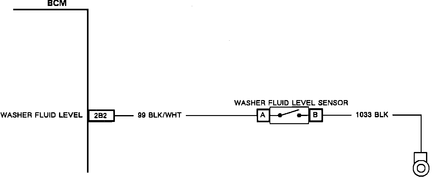 The BCM provides system voltage to the low washer fluid circuit, and the washer fluid level switch provides the single path to ground. The BCM supplies and internally monitors the voltage level of the circuit at pin 2B2. When the washer fluid level circuit is open the BCM will detect system voltage, but if the washer fluid level switch provides a path to ground (low washer fluid condition present), the BCM will detect low voltage. If this condition exists for at least 20 seconds, the BCM will send the "Washer Fluid Low" message to the CCDIC.