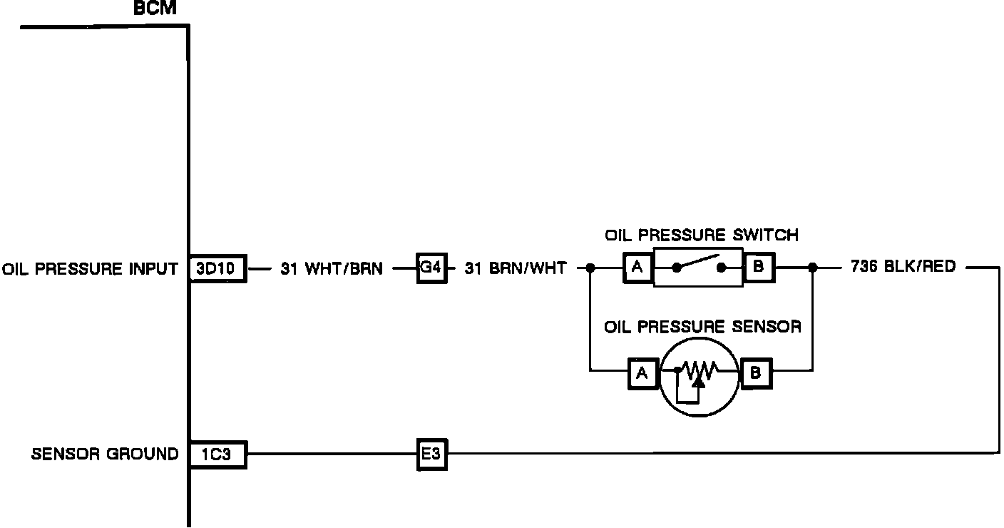 The oil pressure switch is open at normal oil pressure and closes if oil pressure drops below 3 psi. Under normal engine running conditions, the oil pressure switch will be open and the oil pressure sensor will have a variable resistance. The BCM will see a varying voltage on pin 3D10. If the oil pressure drops too low, the voltage on pin 3D10 will drop, either because the oil pressure sensor resistance is low or the oil pressure switch has closed. If this condition exists for 12 seconds, the BCM will send the "Low Oil Pressure" message to the DIC and command the IPC to turn on the Oil Pressure Lamp.