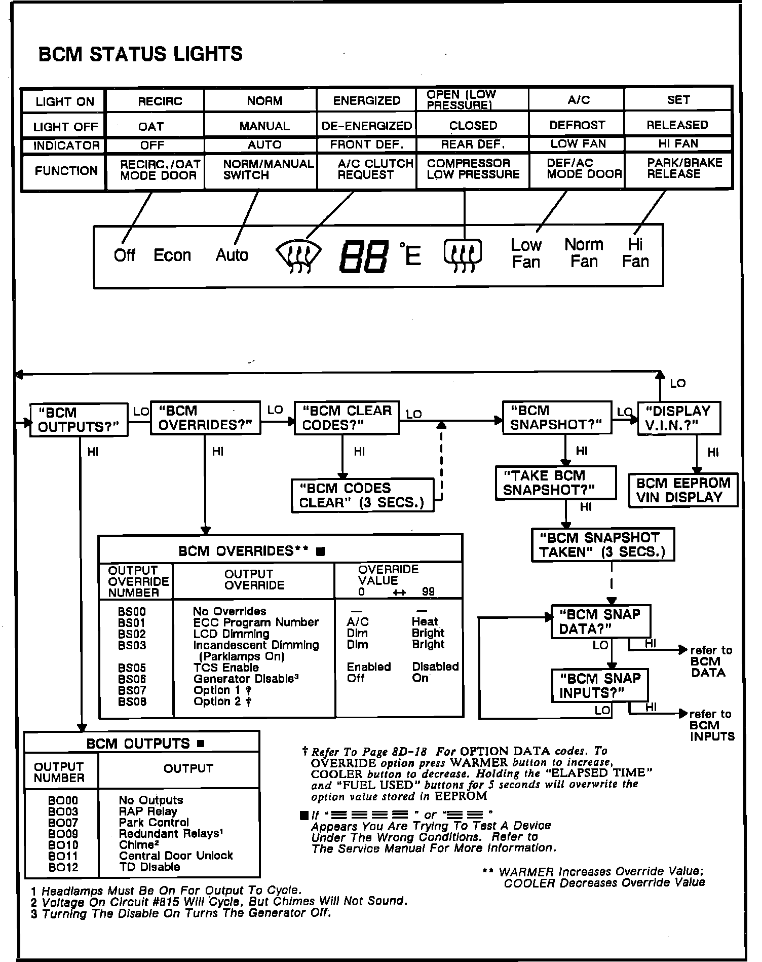 While in the BCM system level in the diagnostic service mode, the mode indicators on the Climate Control Panel (CCP) of the CCDIC are used to indicate the status of certain operating modes. The different modes of operation are indicated by the status light being illuminated or turned off.