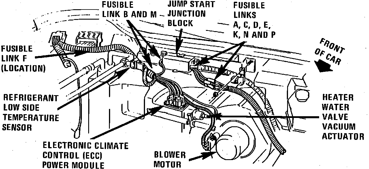 The Electronic Climate Control (ECC) Power Module is located in the Rear of engine compartment, center front of dash.