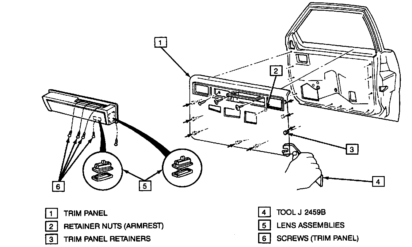 6. Trim panel using tool J 2459B or equivalent, to disengage fasteners on trim panel from holes in door. Disconnect courtesy and warning lamp connectors.