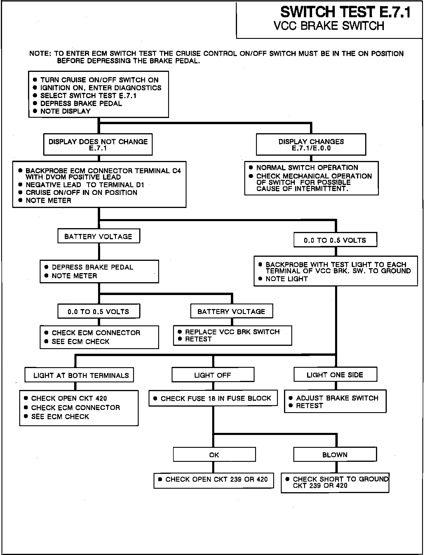 After .7.0 is displayed on the Fuel Data Center (FDC), the PCM/ECM switch test can be initiated by depressing the brake pedal when the brake pedal has been depressed the FDC will display E.7.0. AT this time the HI and LO buttons on the Electronic Climate Control (ECC) panel can be used to select the specific switch test. When a specific test has been selected and that switch activated, the display will alternately display the code for that test and E.0.0 to confirm the switch is working.
