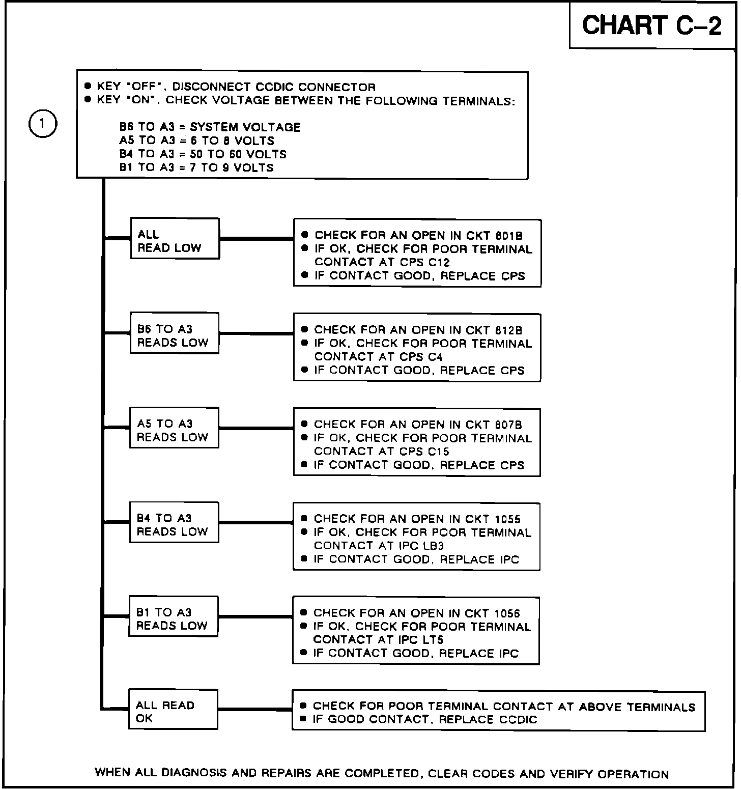 This chart is used because the CCDIC display is completely blank. Causes for this problem could be a loss of CPS power or ground or loss of the vacuum fluorescent power from the IPC.