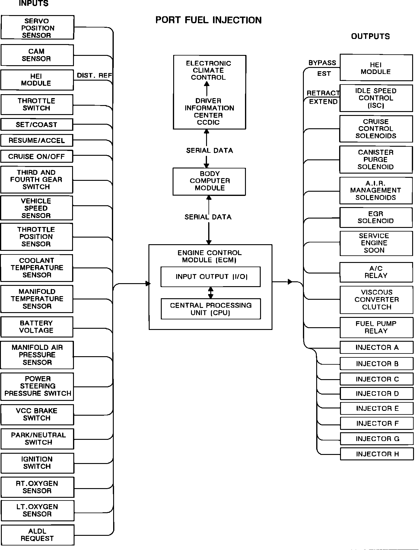 The CCDIC is used by the driver to control the air conditioner and heating system, also used to retrieve diagnostic information (i.e. trouble codes, sensor parameters, etc.), or override certain output components. The DERM monitors, detects, and records the SIR system during operation when system components malfunction, stores the malfunction as a trouble code, and maintains a 36 volt loop reserve energy supply to provide deployment energy in the event the vehicle voltage is low or lost during an accident. The ECM controls the fuel and ignition systems to obtain good performance and low exhaust emissions. The IPC is used to display information to the driver such as vehicle speed, engine rpm, and fuel level. The HVAC Programmer receives information from the CCDIC and carries out the commands necessary to obtain the correct interior temperature.