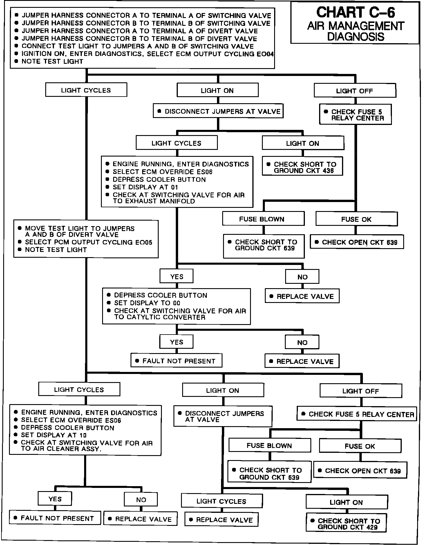 The AIR divert and switch solenoids are supplied with 12 volts on circuit 639 from the 19 amp number 3 solenoid fuse on the underhood relay panel. The ECM controls air management by grounding AIR switch solenoid circuit 436 and AIR divert solenoid circuit 429. To divert air to the air cleaner, the divert solenoid is de-energized. When pin E9 at the ECM is grounded, the divert solenoid energizes and diverts air to the switching valve. When the switch solenoid is de-energized the air is routed to the catalytic converter and when pin E6 at the ECM is grounded the air is routed to the exhaust ports.