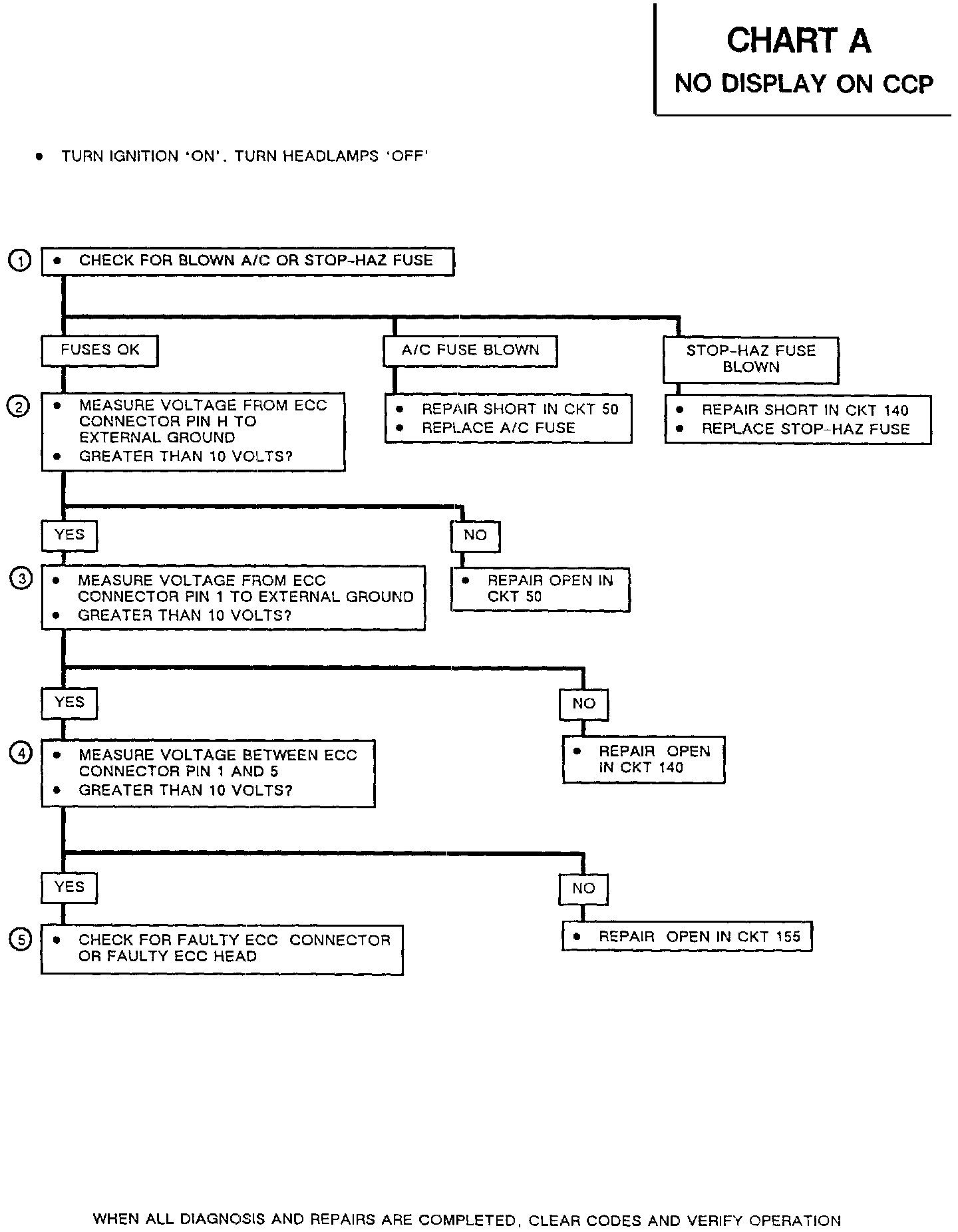 1. If the A/C or Stop-Haz Fuse is blown, the ECC Head will not receive its voltage supply, resulting in a blank display. If a fuse is blown there must be a short to ground in CKT 50 or CKT 140.