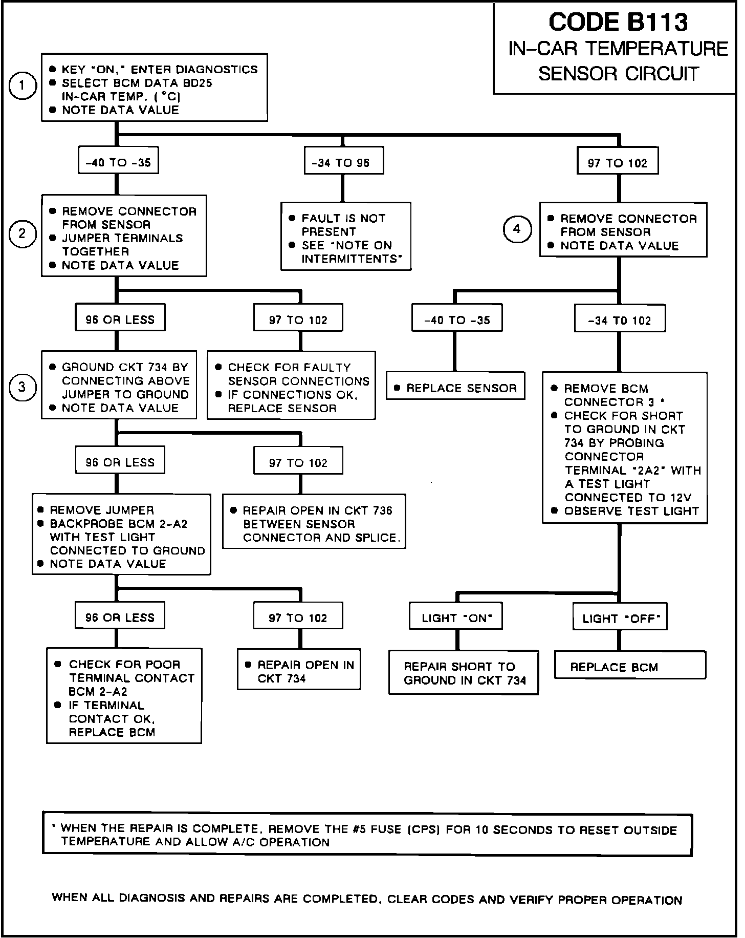 Code B113 will set if the ignition is on, the outside temperature sensor has not failed, outside temperature is above - 18°C (O°F) and the signal voltage indicates less than -34°C (open CKT) or over 96°C (shorted CKT). During the time the failure is present a substitute temperature reading will be implemented to allow continued operation of the climate control system. The in-car temperature reading BD25 will, however, display the actual sensor reading.