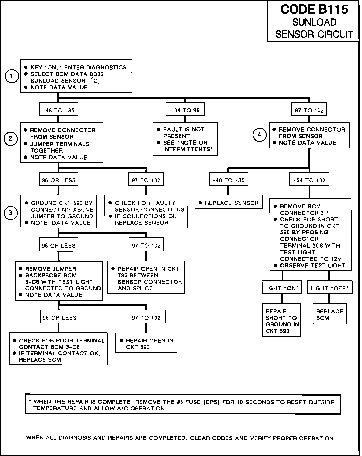 Code B115 will set if the ignition is on, the outside temperature sensor has not failed, outside temperature is above -18°C (O°F) and the signal voltage indicates less than -34°C (open CKT) or over 96°C (shorted CKT). During the time the failure is present a substitute temperature reading will be implemented to allow continued operation of the climate control system. The sunload temperature reading BD32 will however, display the actual sensor reading.