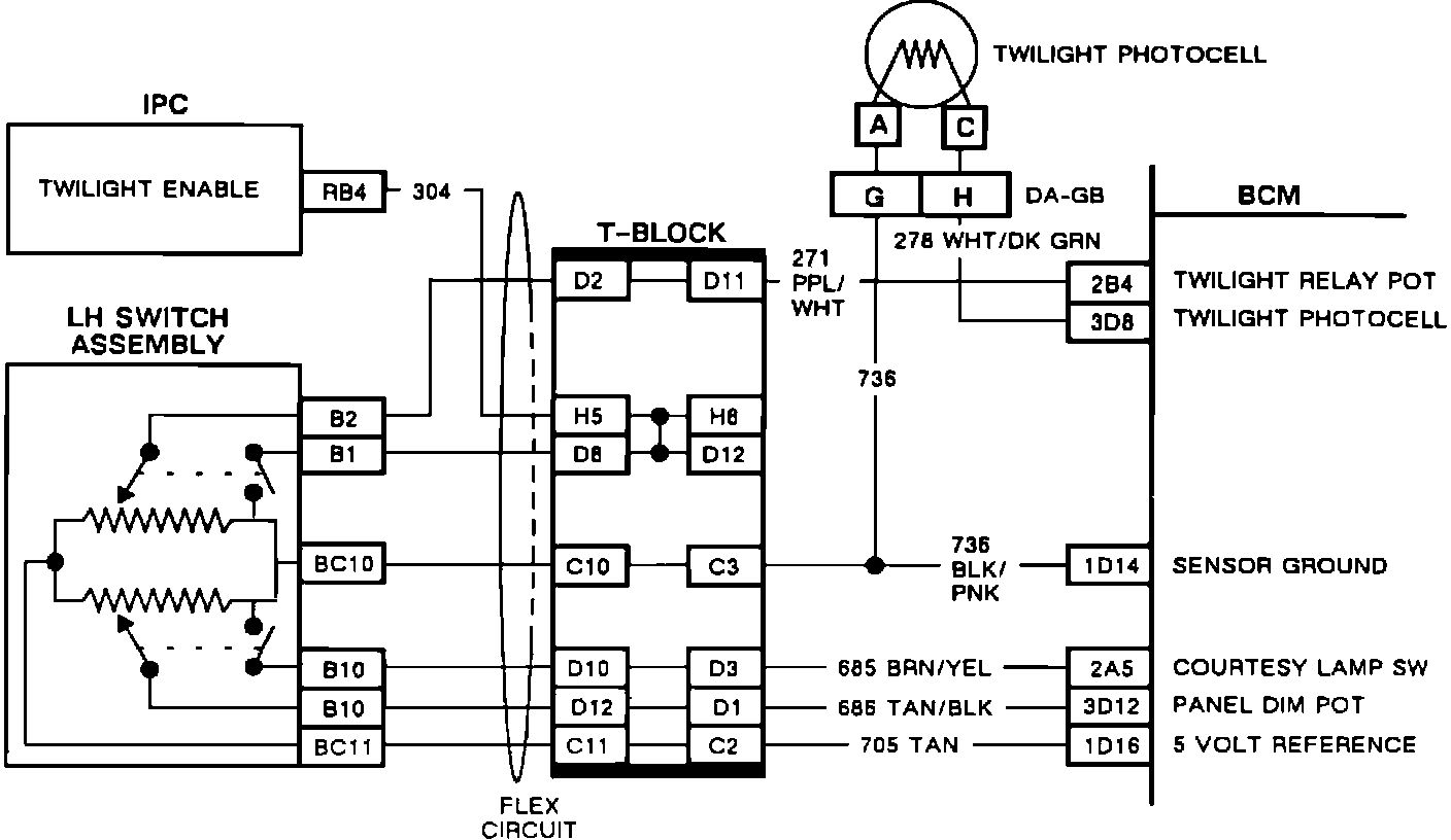 The courtesy lamps panel switch is part of the dimmer control potentiometer. In the left switch assembly, the courtesy lamps enable switch closes when the dimmer is moved to the extreme right. The BCM supplies a signal voltage on CKT 685 which is pulled to ground through CKT 736 when the switch contact is closed.
